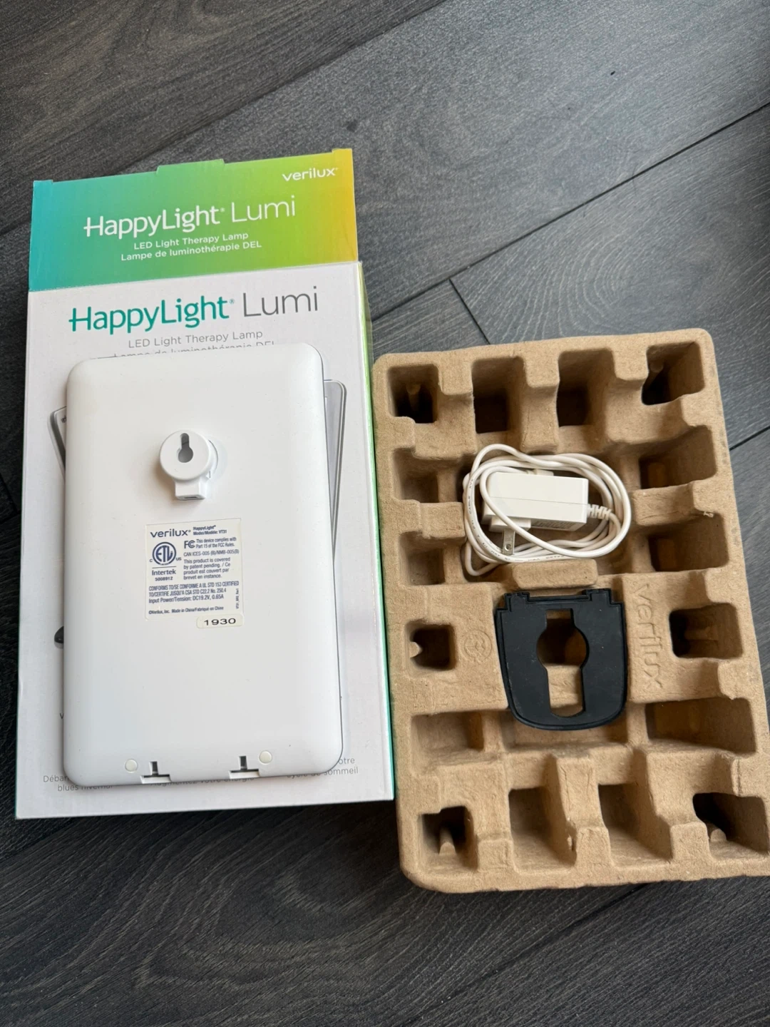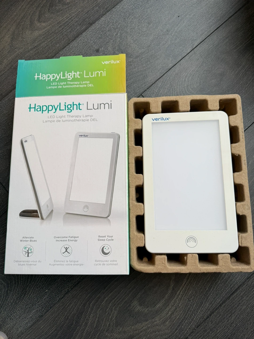 This is a Verilux HappyLight Lumi LED Light Therapy Lamp. It's designed to help alleviate winter blues, overcome fatigue, and reset your sleep cycle. Includes original box and power adapter.
