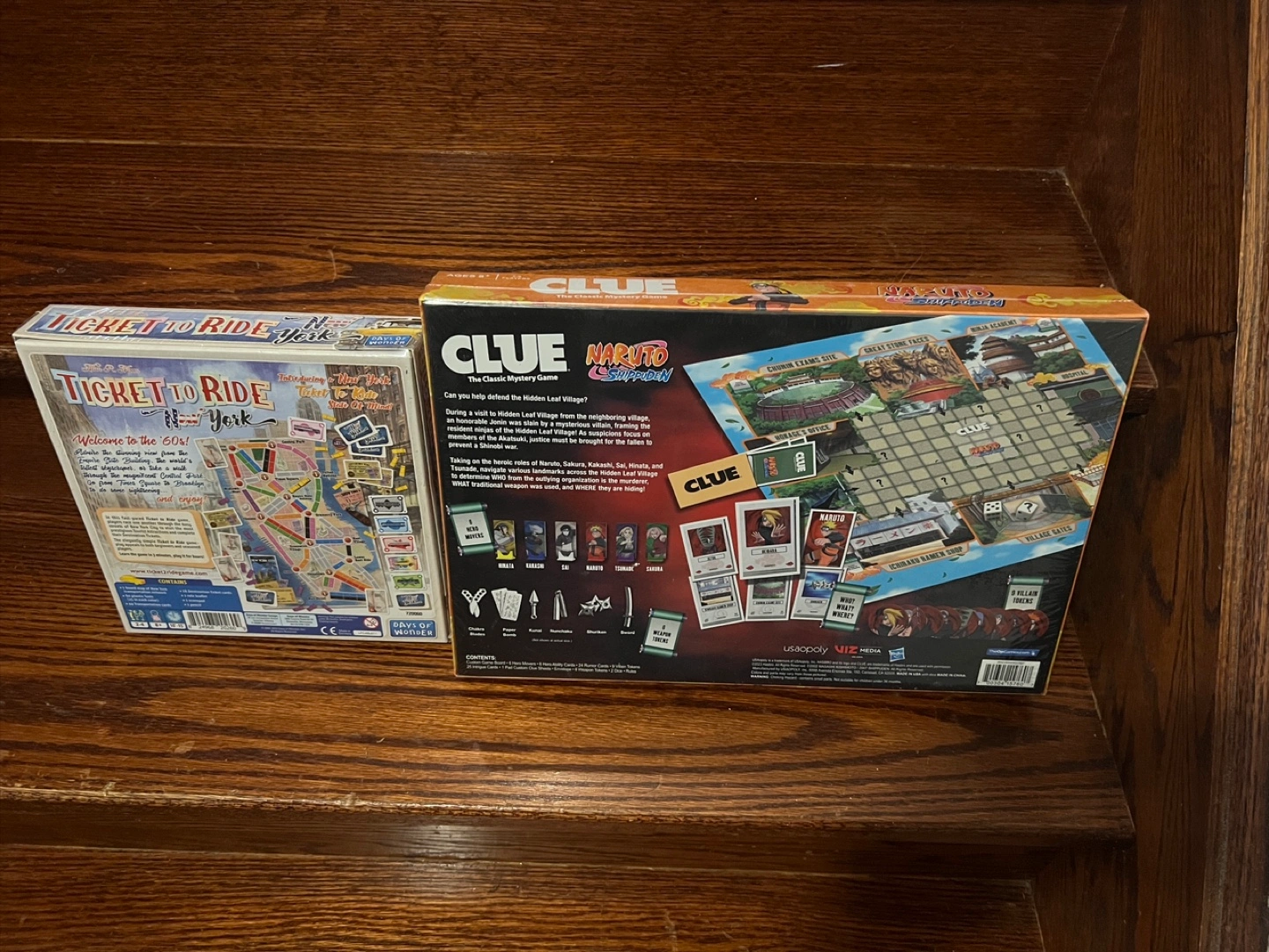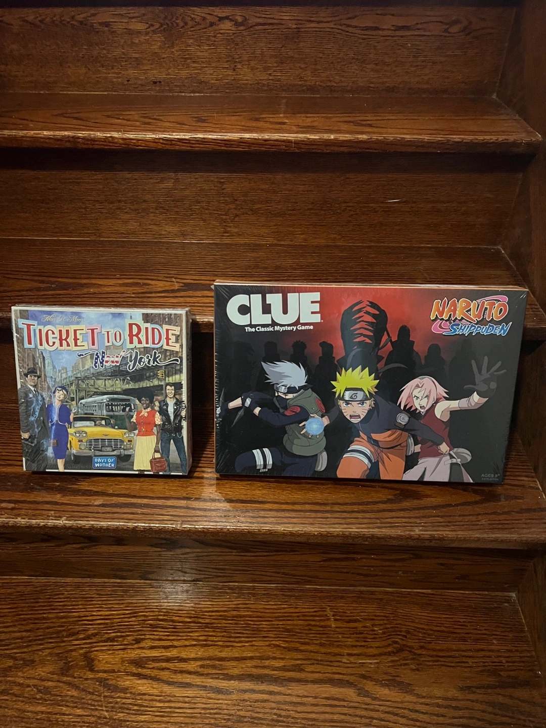 Includes the Clue Classic Mystery Game: Naruto Shippuden Edition and Ticket to Ride: New York Edition. Both are classic board games for family fun. Age recommendation for Clue is ages 8+. Ticket to Ride is for ages 8+. Both are brand new with plastic wrapping. From smoke free home. Please check my other posts.