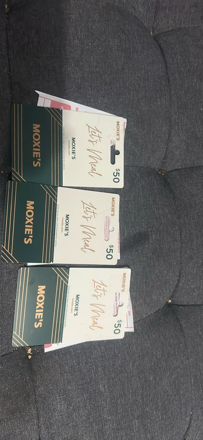 28Selling Moxie's gift cards, each with a value of $50. Selling for $40 each