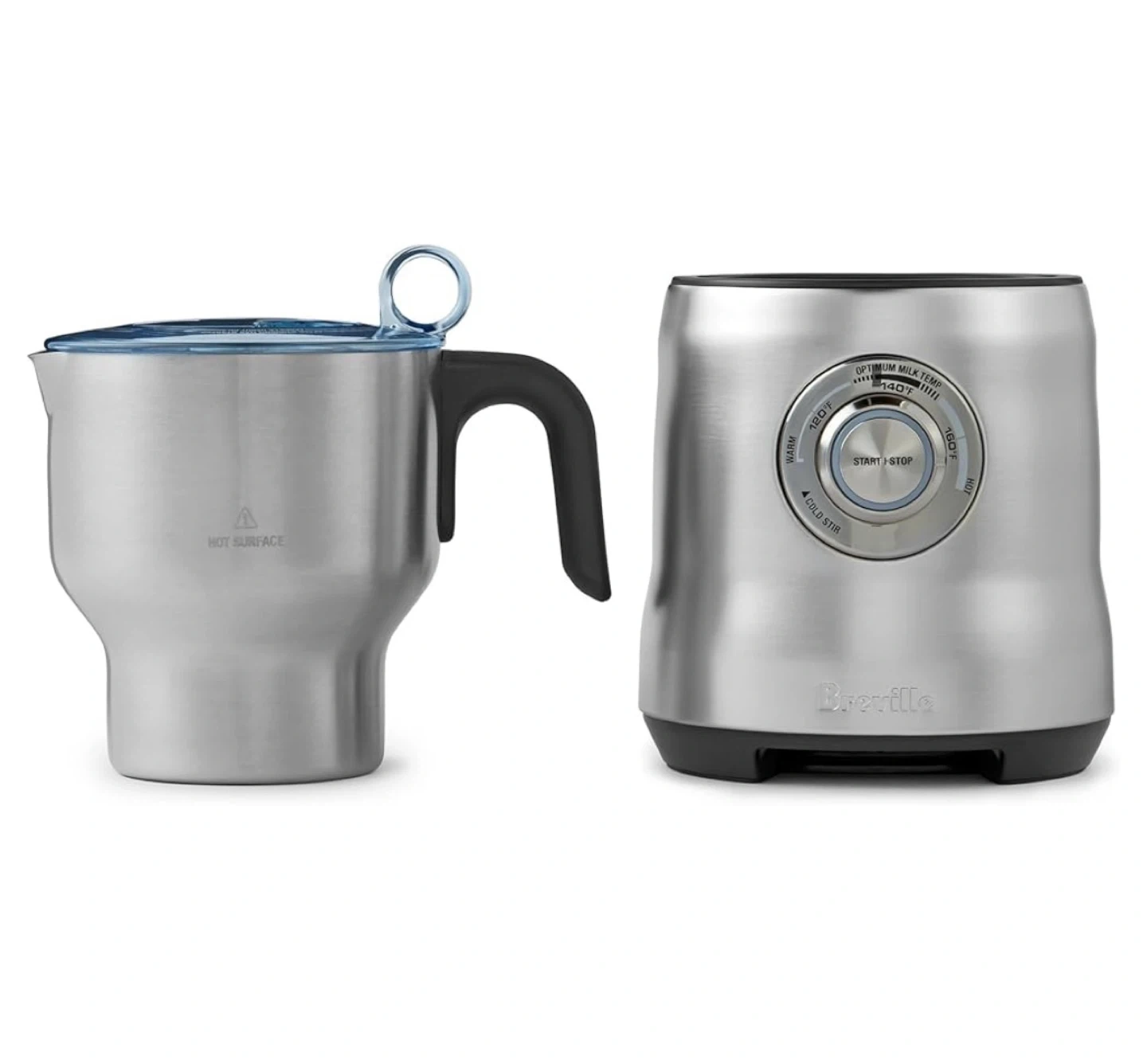 Breville Milk Cafe milk frother. It's great for making hot or cold milk foam for your favourite beverages. Includes multiple settings for temperature and milk texture. Stainless steel jug with a black handle. Comes with a blue lid.