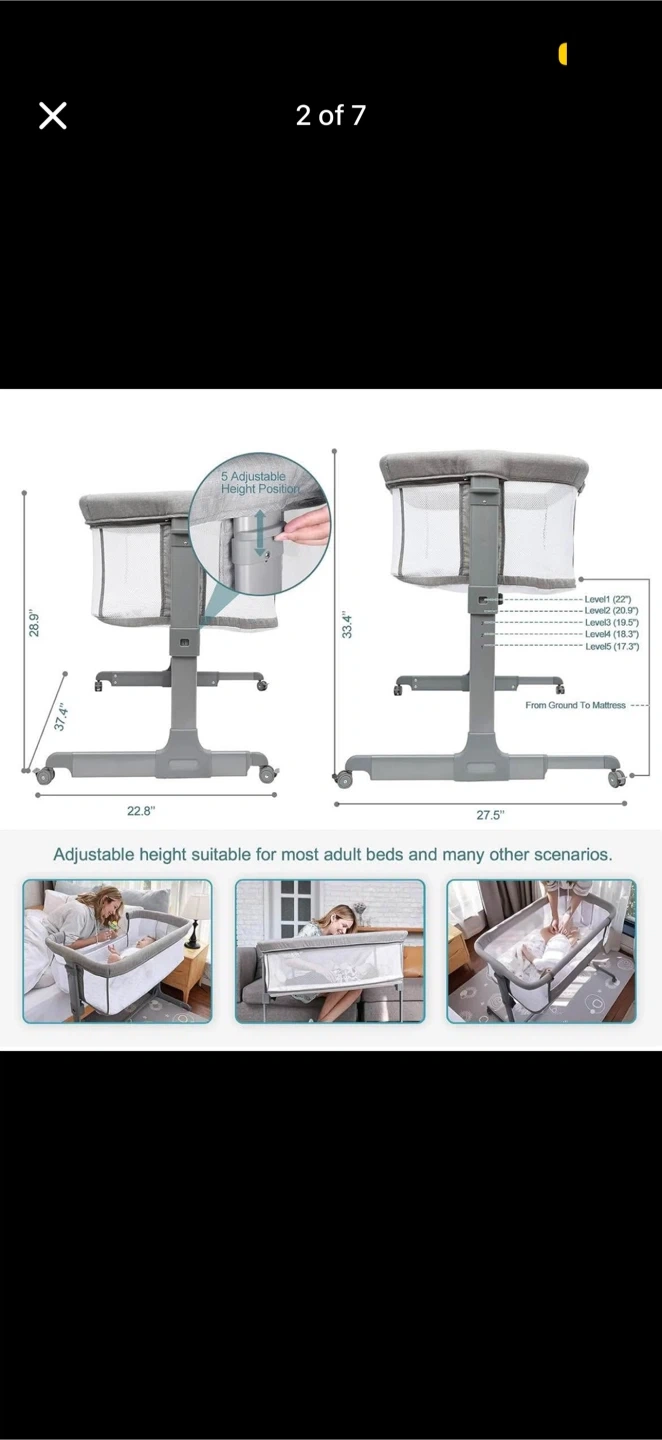 This grey bassinet offers 5 adjustable height positions, making it suitable for most adult beds. It comes with a safer & breathable mattress and a machine washable sheet. Throwing in free mattress protector. Also has wheels that can be locked (great for wheeling to different rooms if needed).