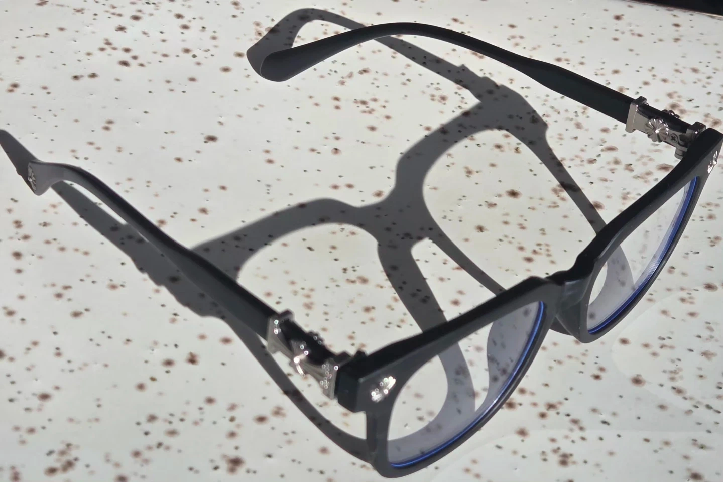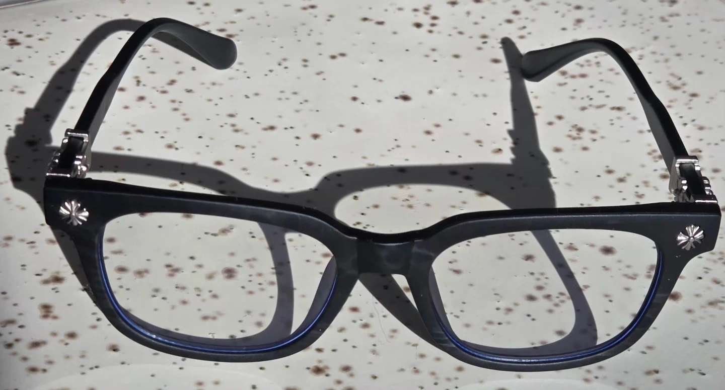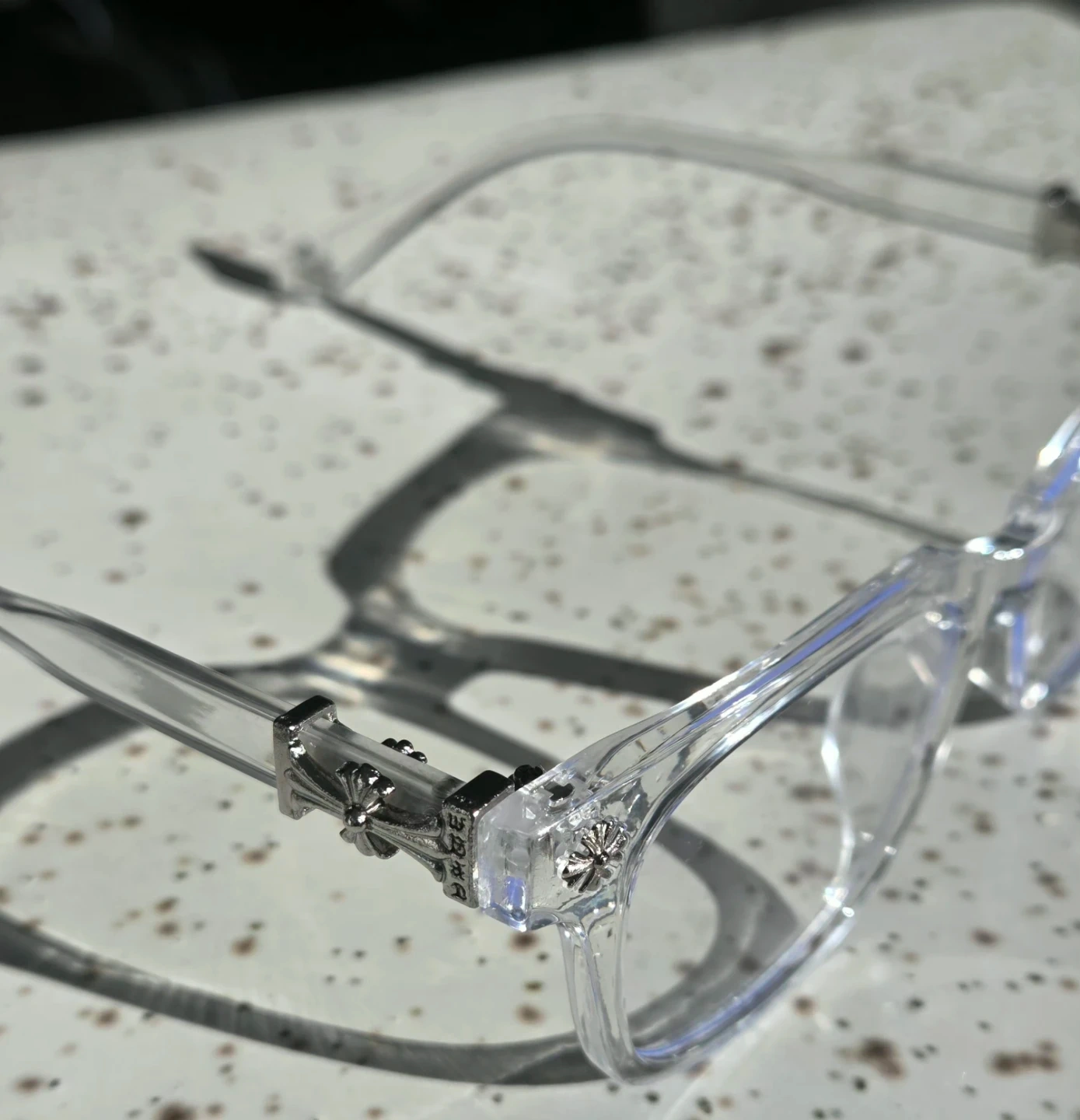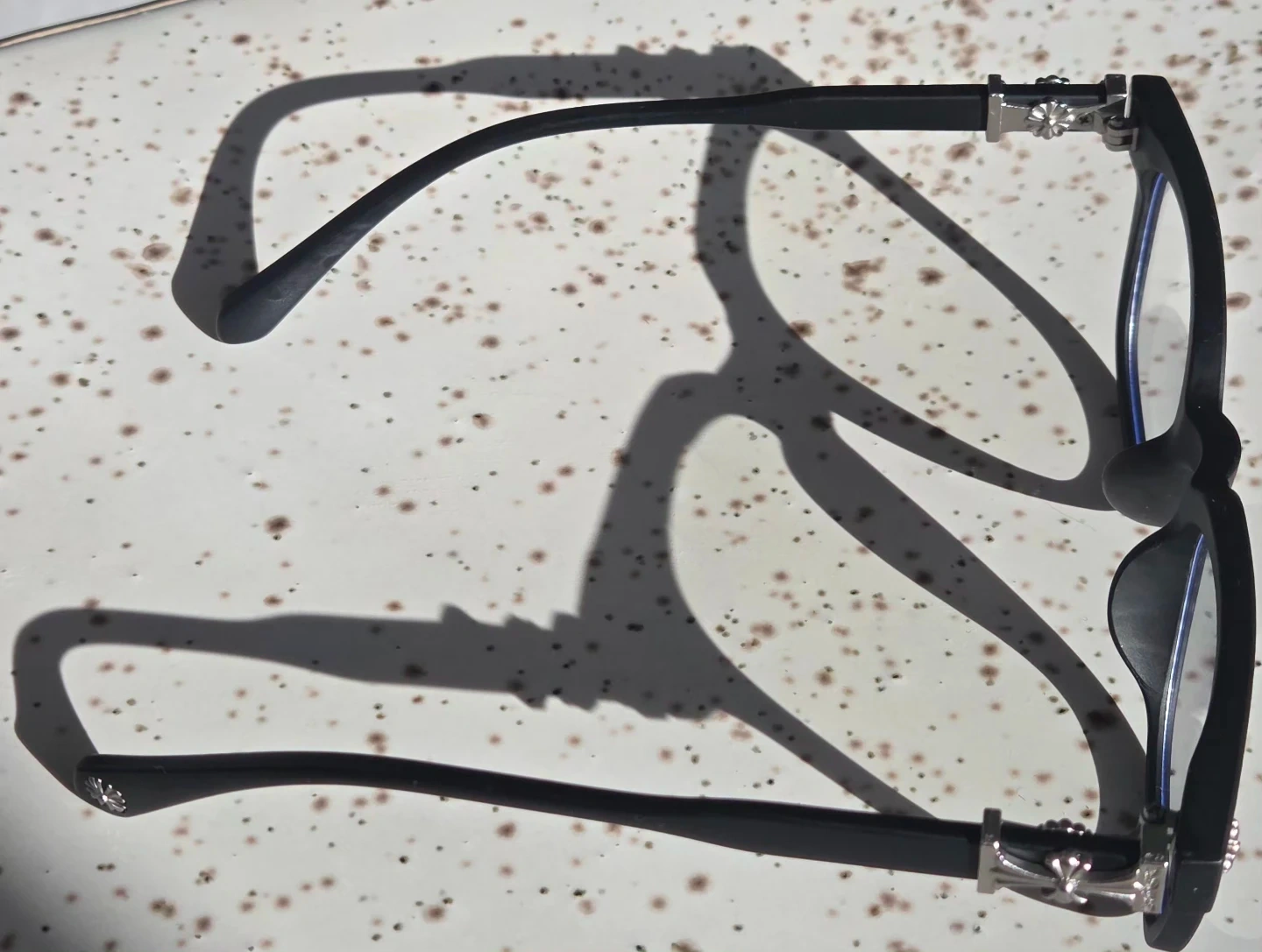 These are black Chrome Hearts glasses with silver detailing. They have a classic rectangular shape and blue inner trim. Perfect for adding a stylish touch to your everyday look!