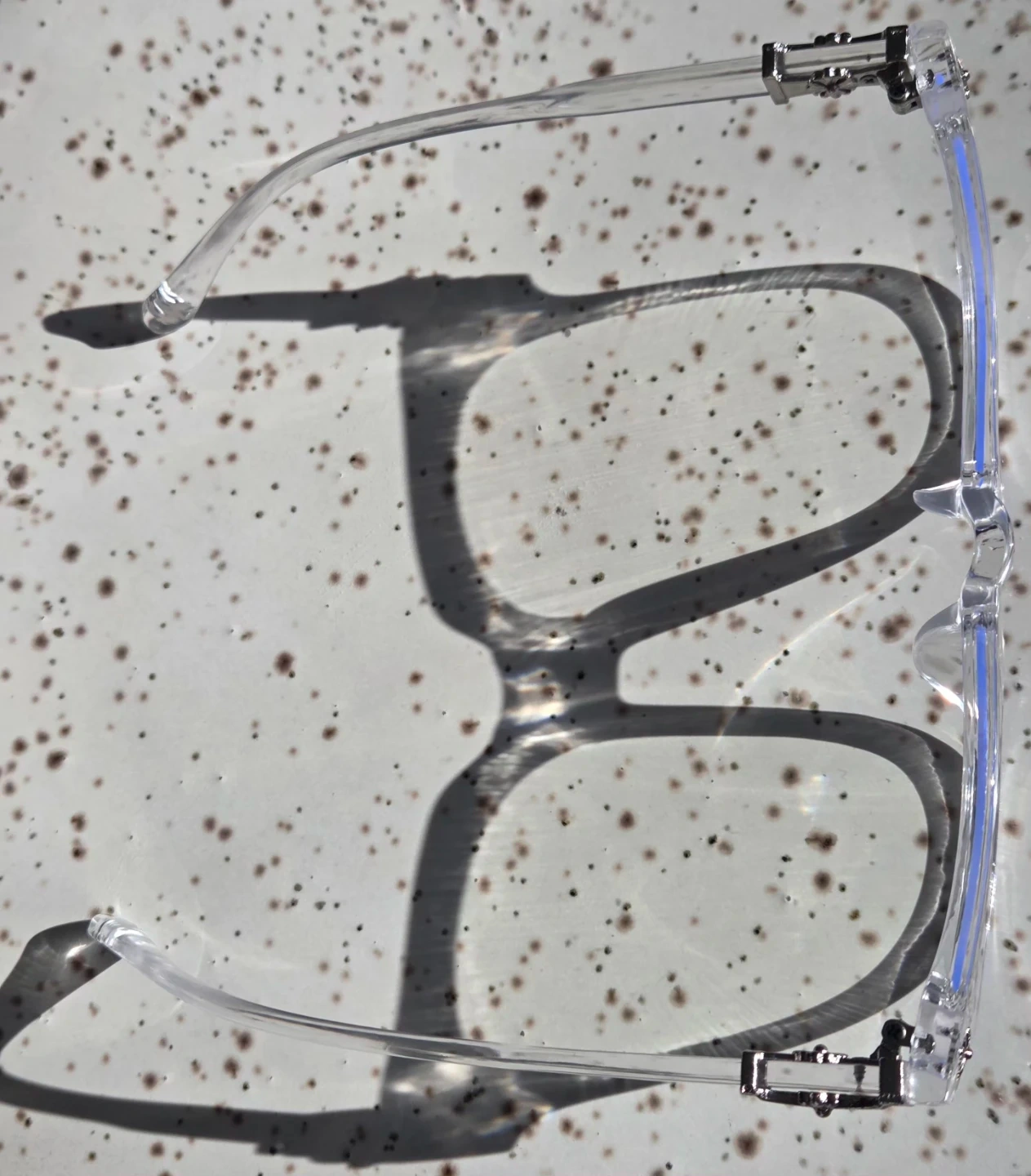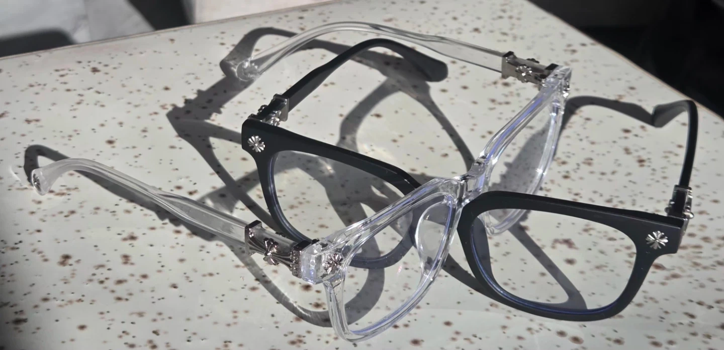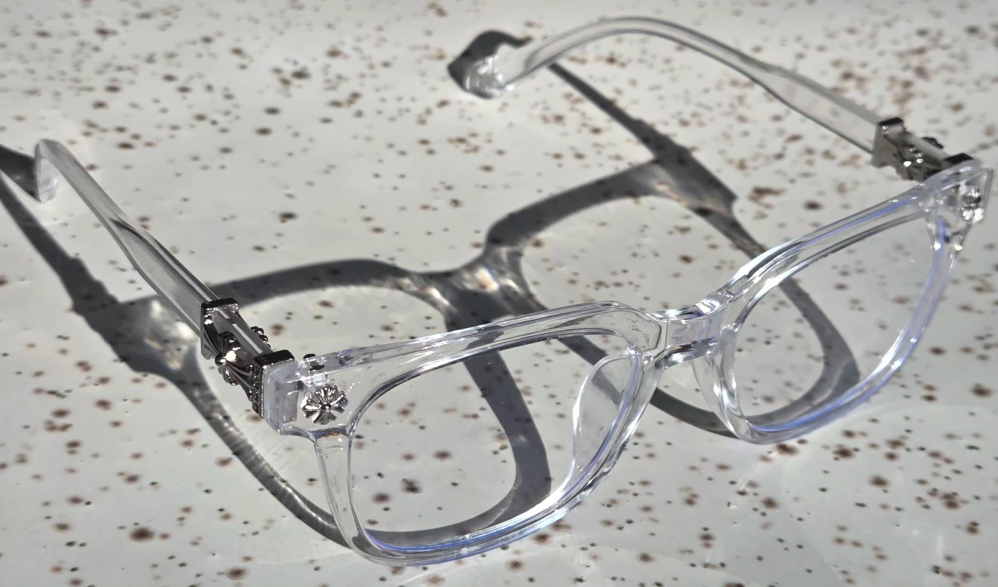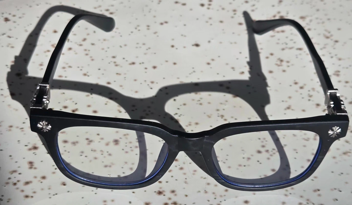 These are black Chrome Hearts glasses with silver detailing. They have a classic rectangular shape and blue inner trim. Perfect for adding a stylish touch to your everyday look!