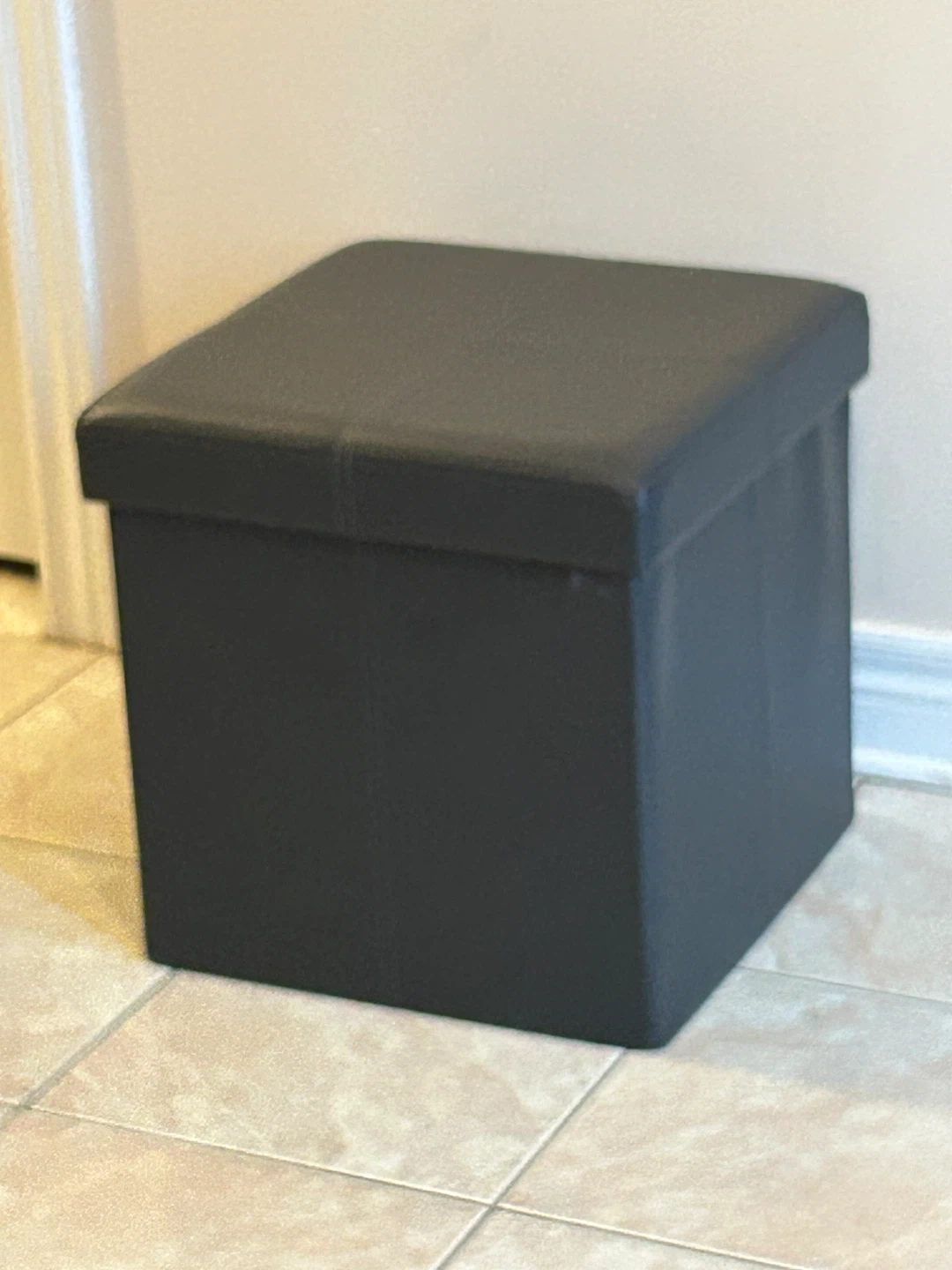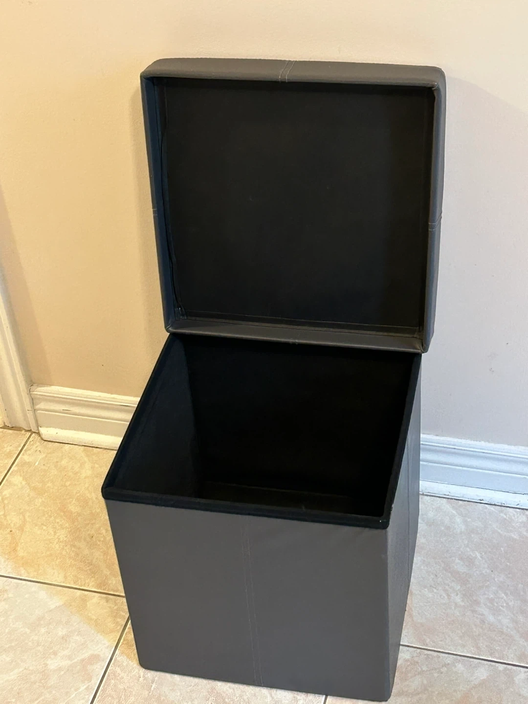This is a foldable storage ottoman in a dark grey faux leather. It's great for stashing blankets, toys, or other household items. It can also be used as extra seating or a footrest.