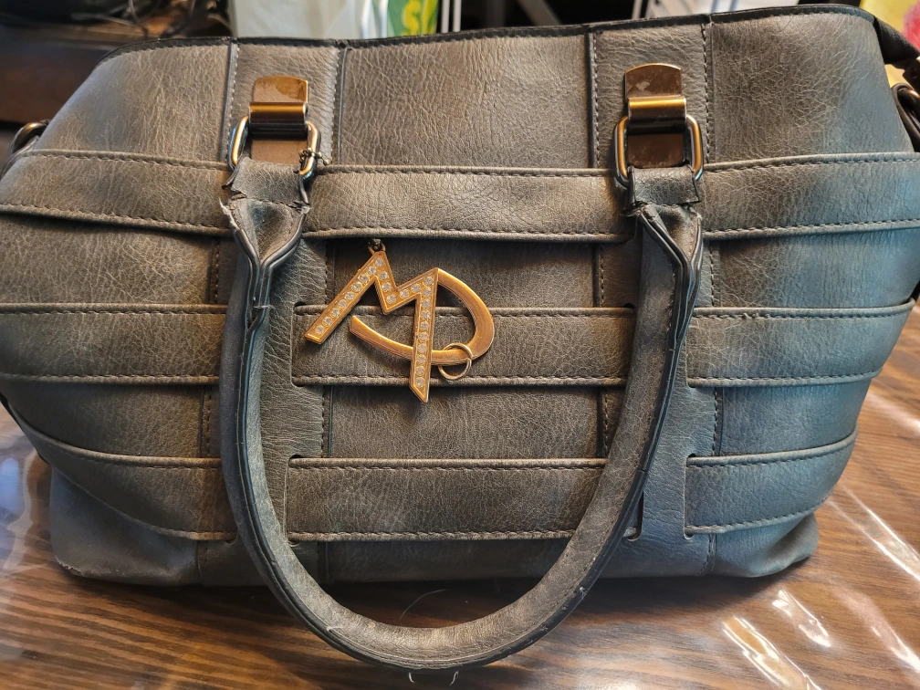 20FREE- Forrva gal who loves to brinng their treasured possessions with her or be prepared for anthing!. Goving away gently used solid grey handbag. It has a metallic zirconia embossed trinket, in good condition and has multiple compartments inside for organization