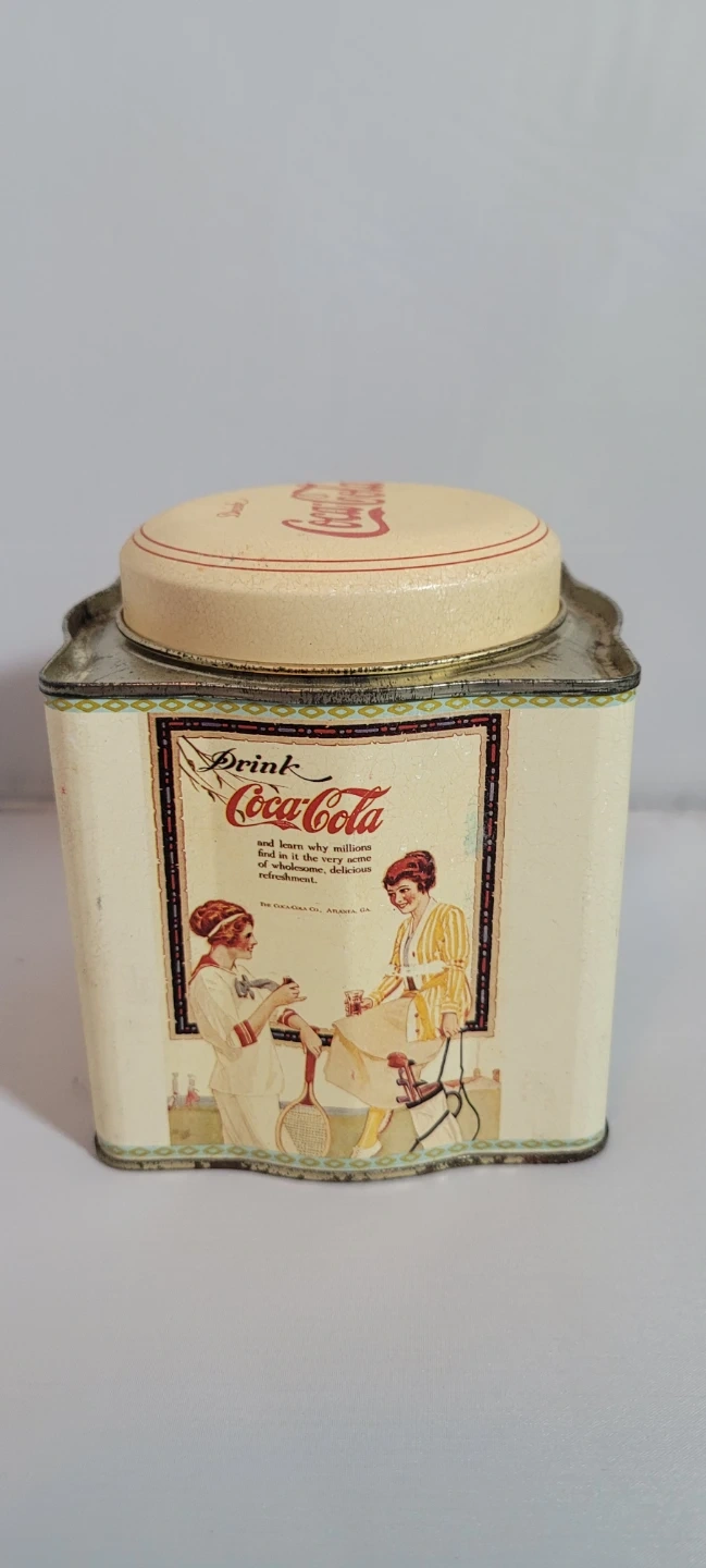 This is a vintage Coca-Cola tin featuring classic artwork. It's a great piece for collectors or as a nostalgic decor item. The tin has the iconic Coca-Cola logo and graphics from an earlier era.