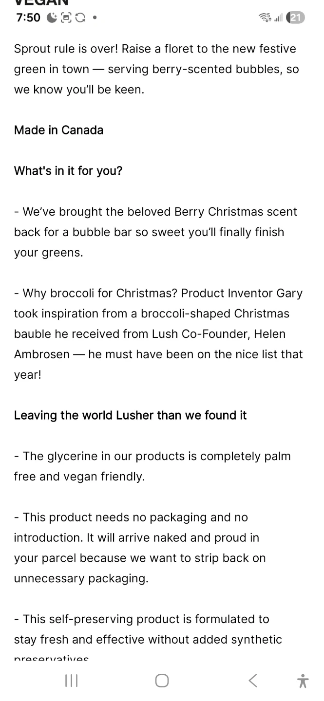 This is the Sparkly Broccoli bubble bar, featuring a berry scent for festive bubbles. It's made in Canada and uses glycerine. The product arrives naked with no packaging. This bubble bar is a vegan-friendly product.