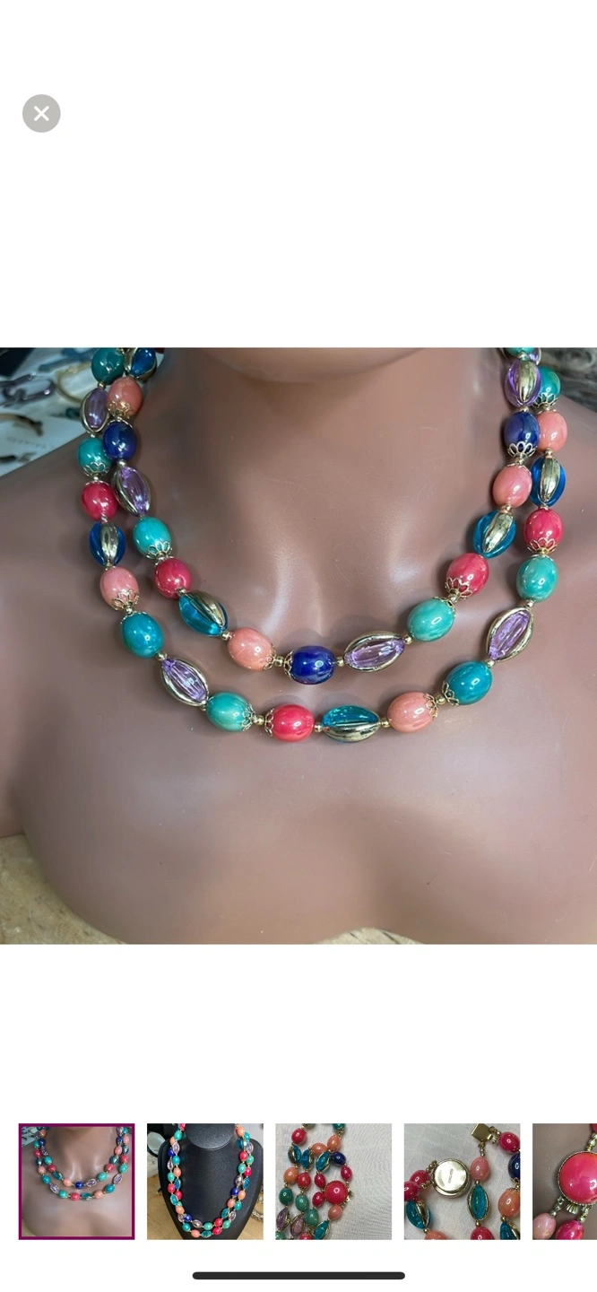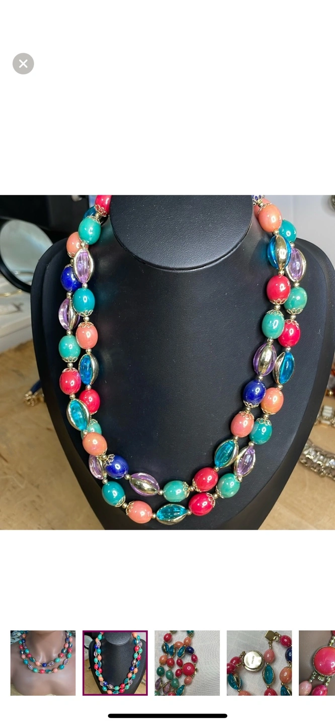 Stunning double-strand necklace. Features vibrant, colourful beads. Gold-toned clasp incorporates a small working watch. Unique statement piece.