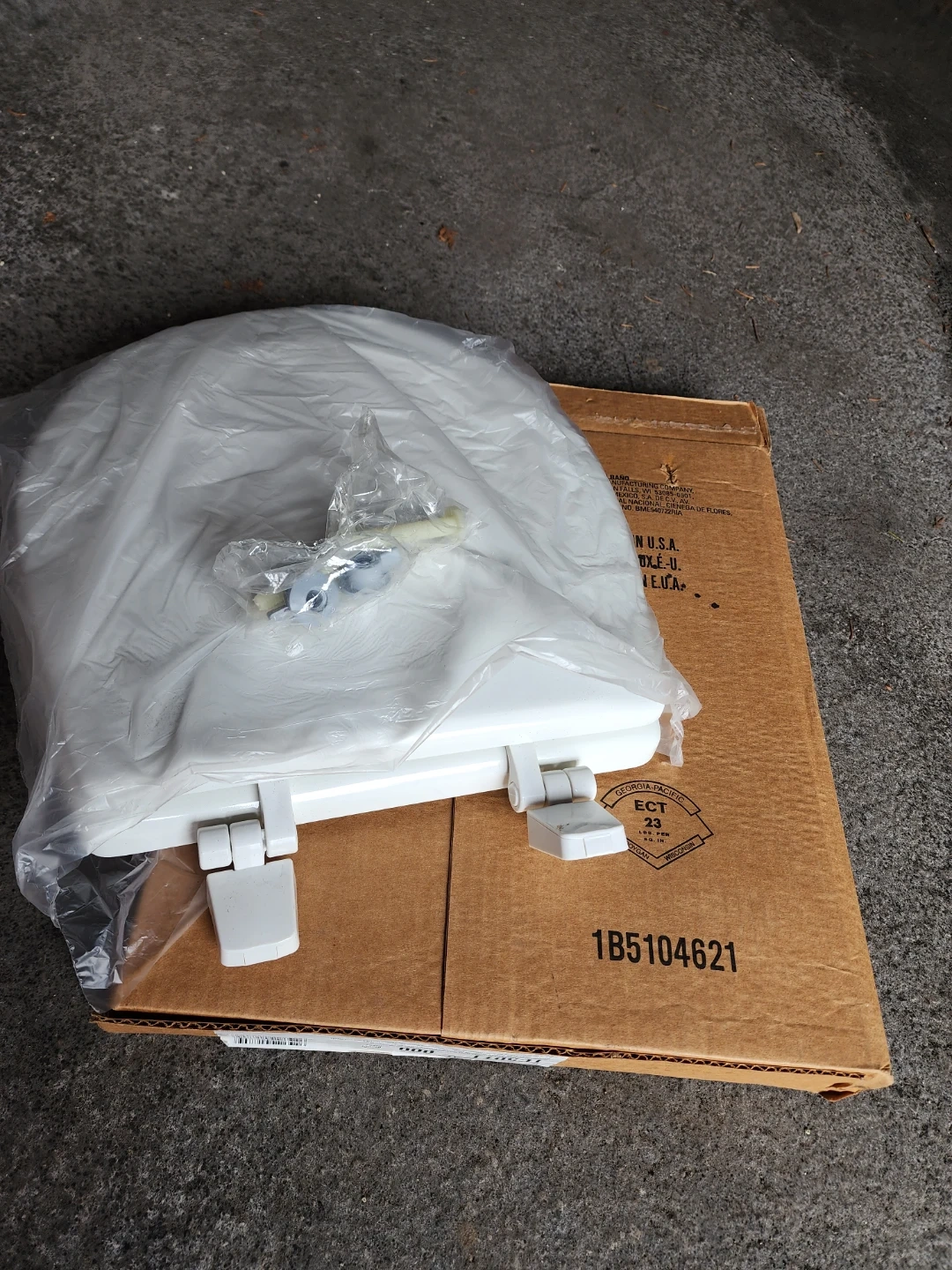This is a Bemis TC50TT closed front toilet seat with a cover. It's white in colour and made of plastic. Includes mounting hardware. For infants use.