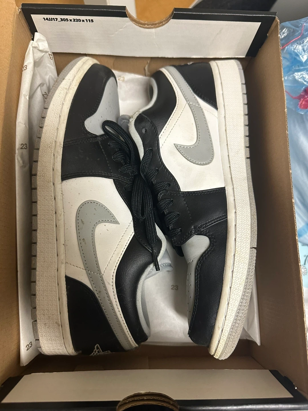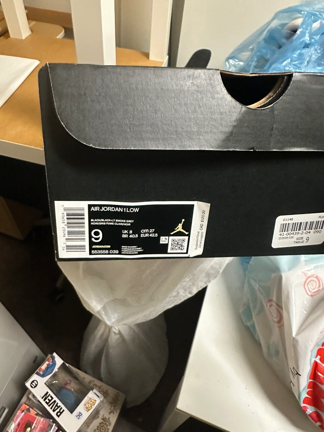 These Air Jordan 1 Lows come in a black, white, and light smoke grey colourway. They're a size 9 US Men's / 10.5 US Women's. Includes the original box. These are great for everyday wear!