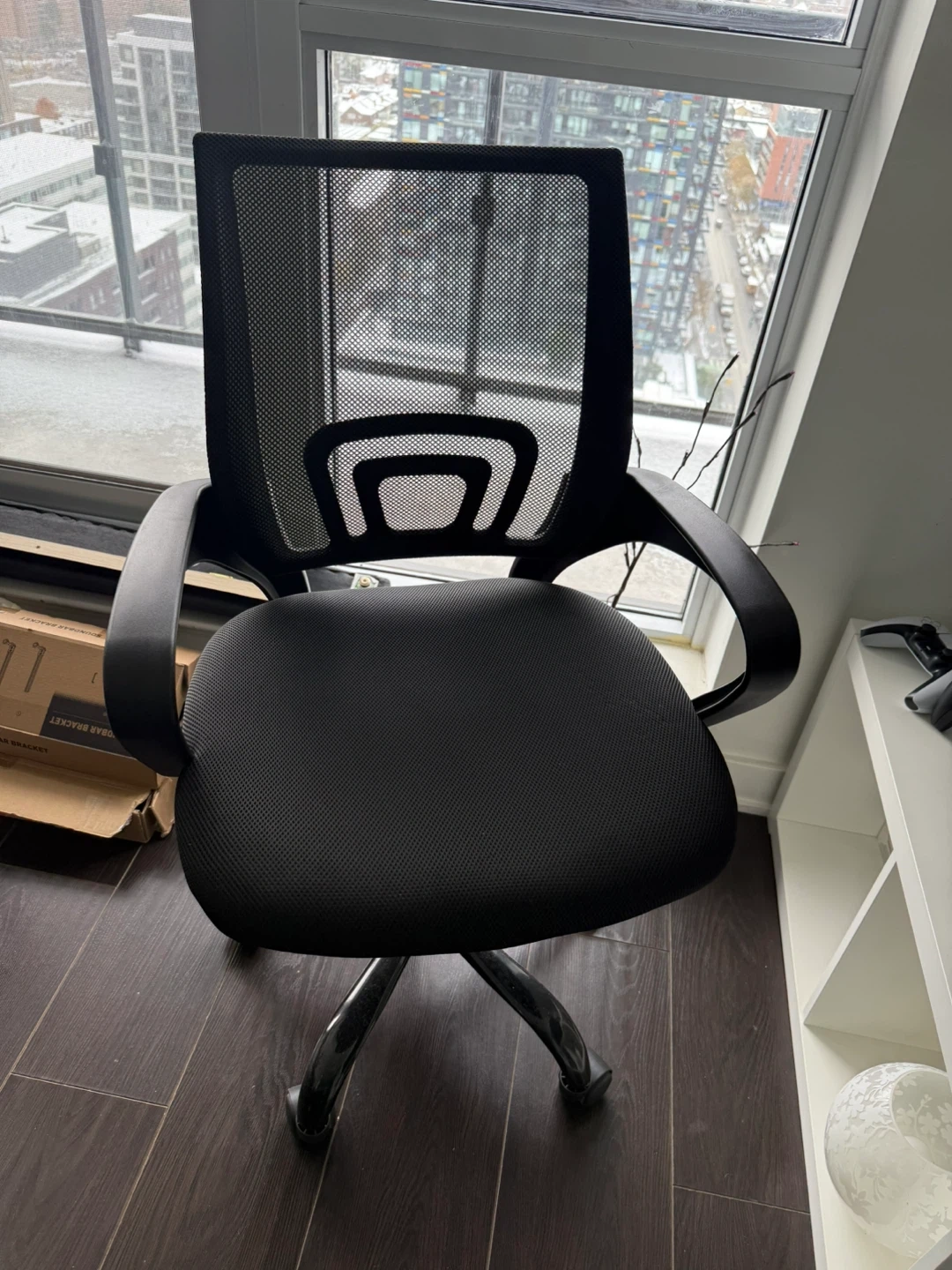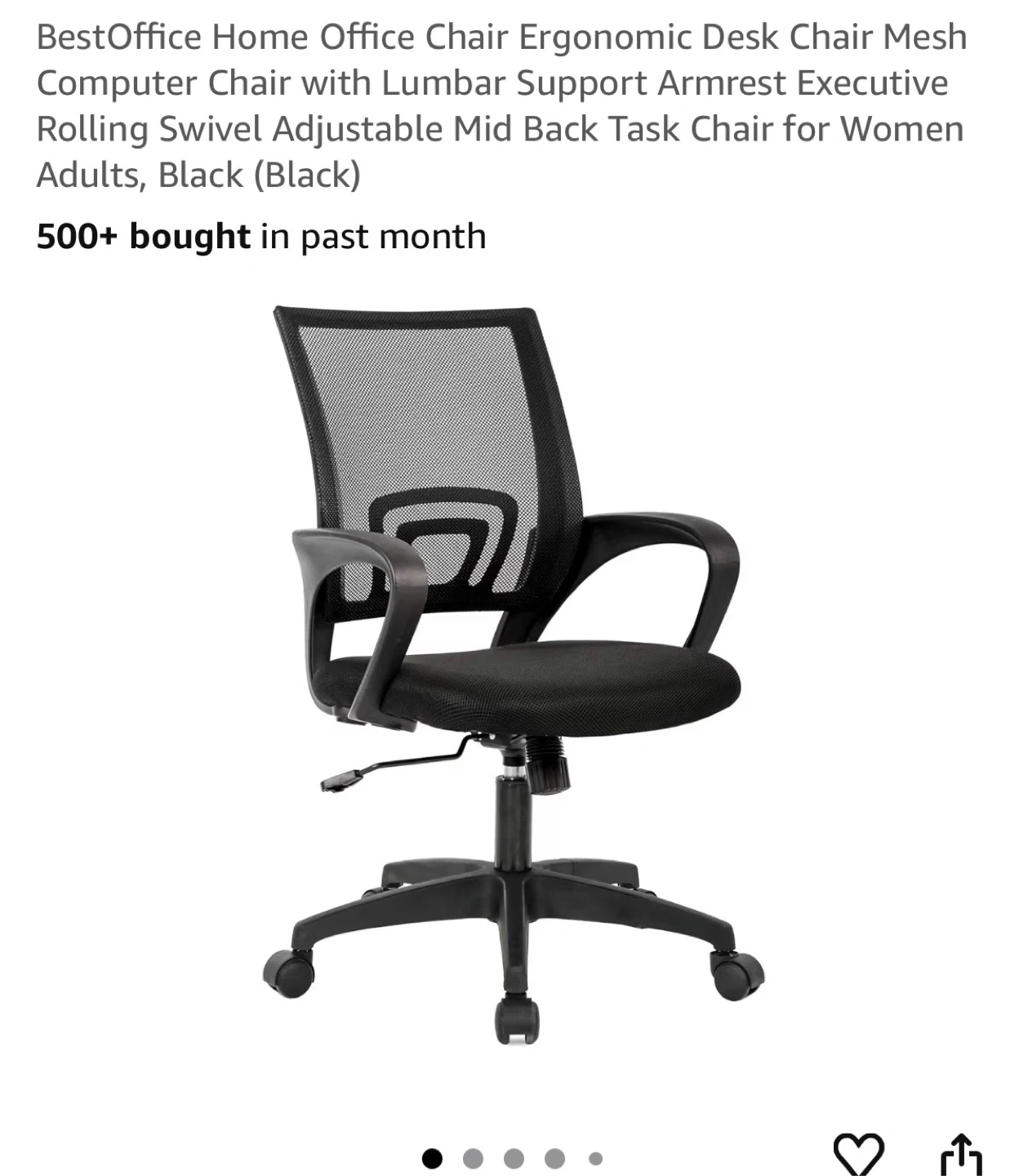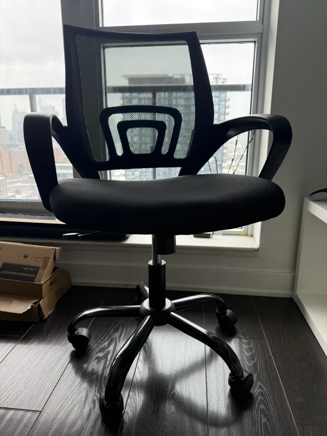 Selling a BestOffice ergonomic desk chair in black. It's in great shape and ready for a new workspace! The chair features a mesh back for breathability and lumbar support for extra comfort during long work sessions. Dimensions are shown in the picture.