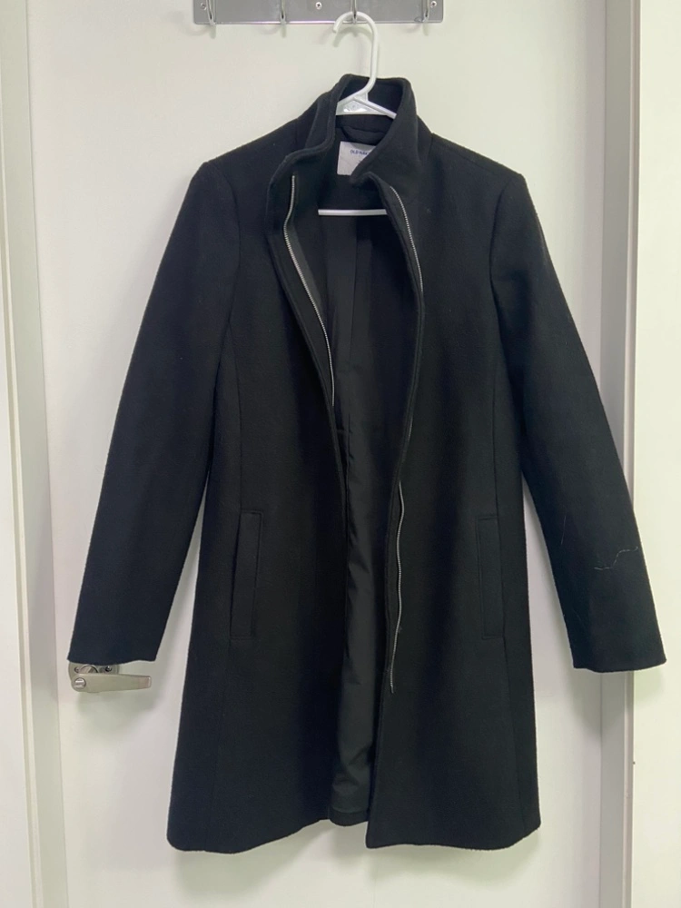 Black coat with zipper closure and pockets. Size Small . Long sleeves. Collar.