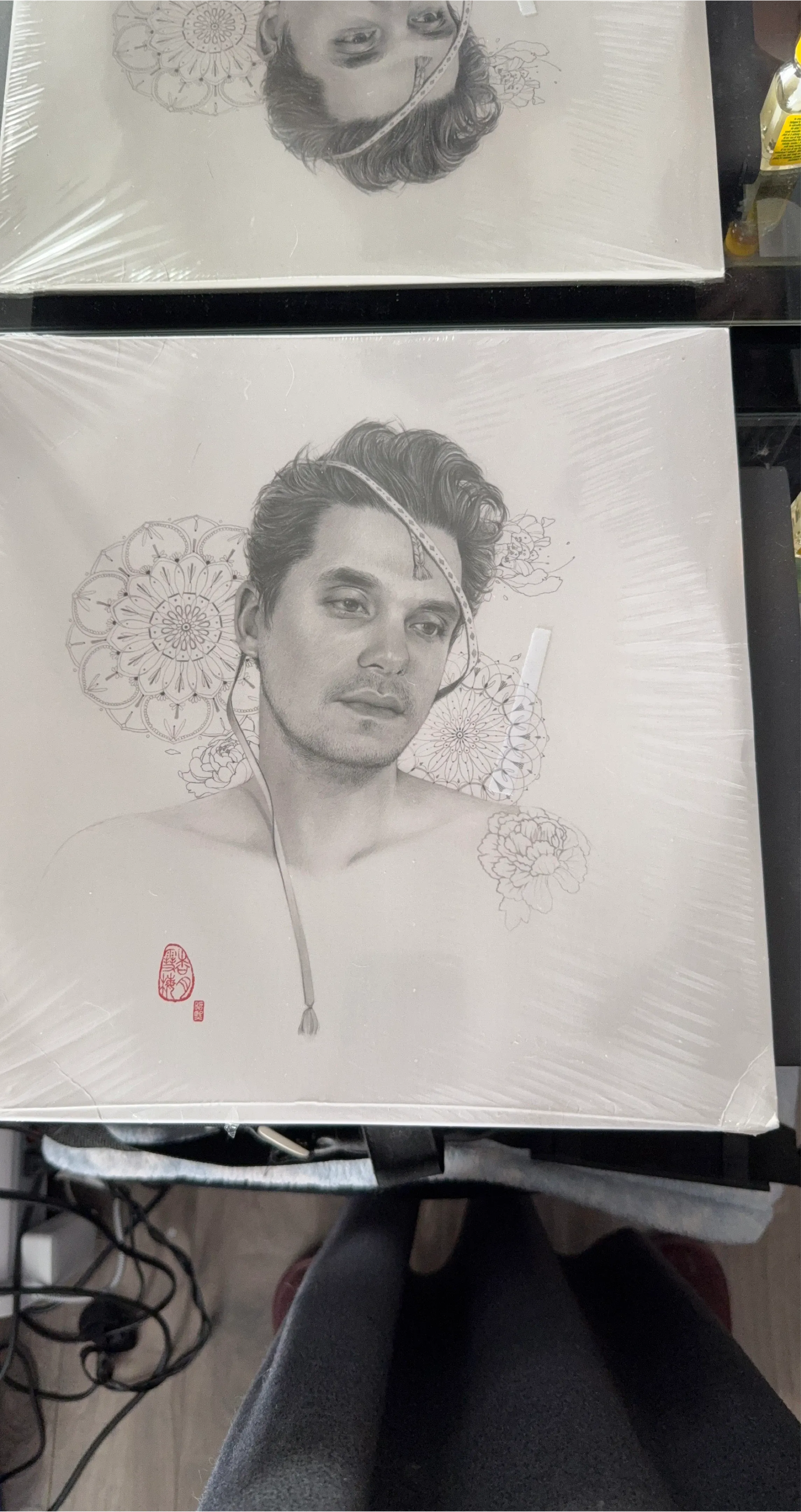 This is the vinyl record album 'The Search for Everything' by John Mayer. It features a portrait illustration of the artist. The album is still sealed in its original plastic wrap, indicating it's in new condition.