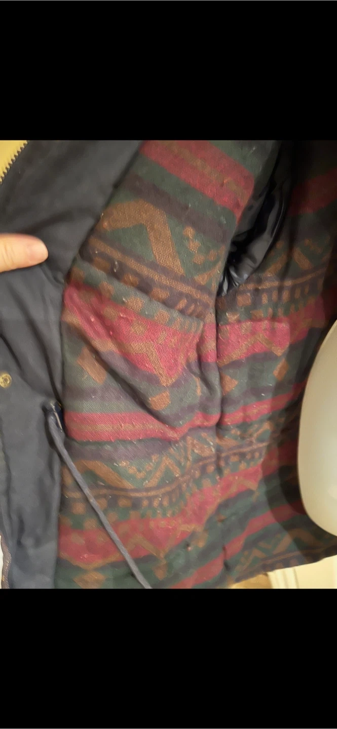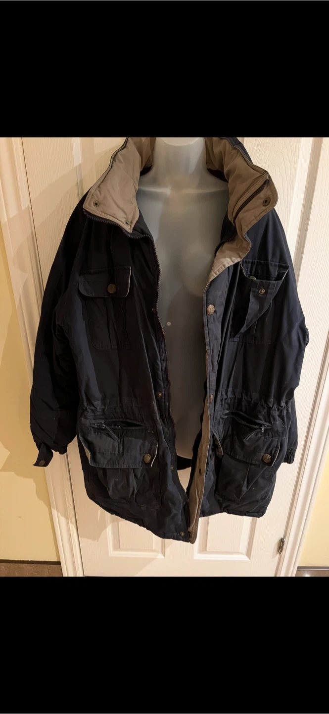 This is an Original Windbreaker jacket in size XL. Shell is 65% polyester and 35% cotton with an acrylic coating. The lining is 100% nylon and the filler is 100% polyester. It's made in Hong Kong.