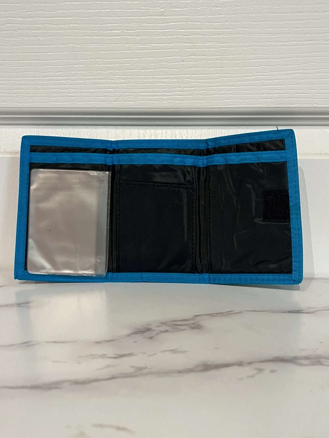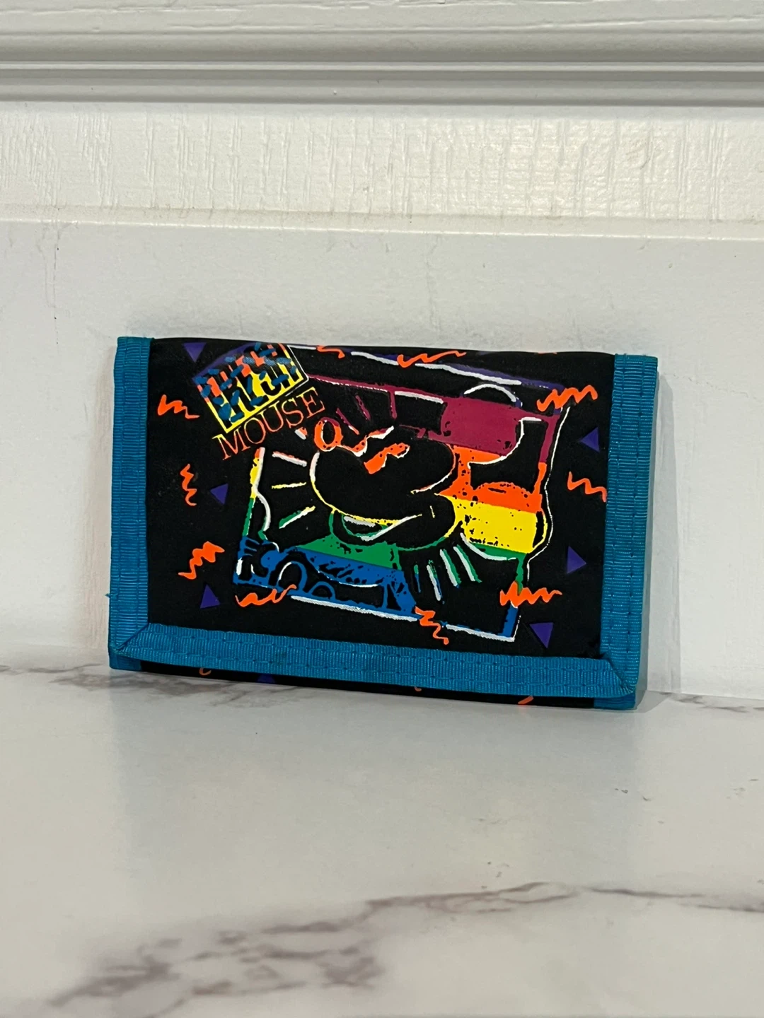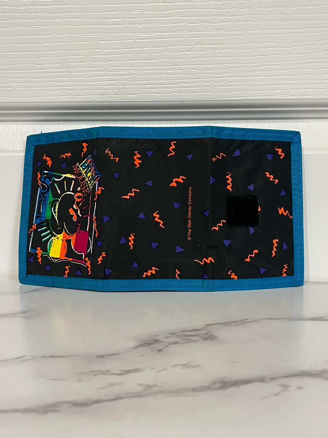 New and never used. Colorful Mickey Mouse tri-fold wallet. This has a super cool 90s vibe with bright abstract art and a teal trim. Velcro closure. Inside is a clear ID slot and other slots for cards.
