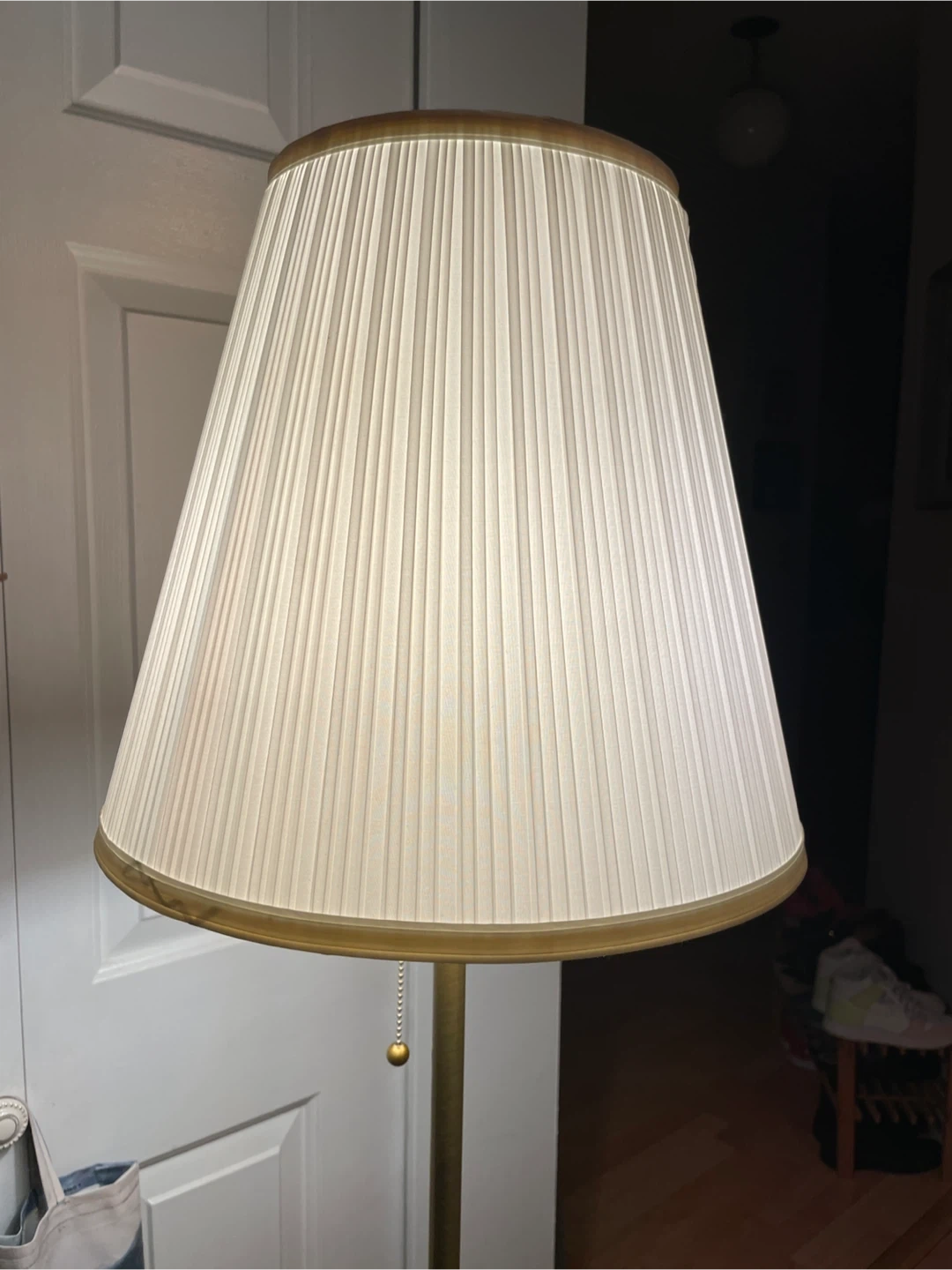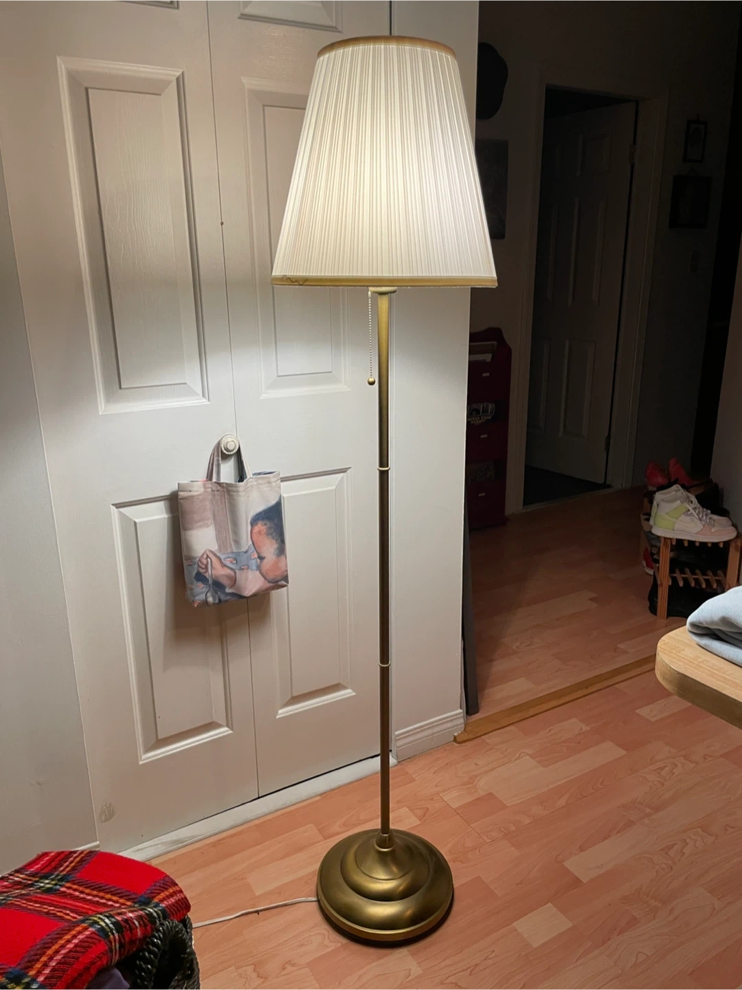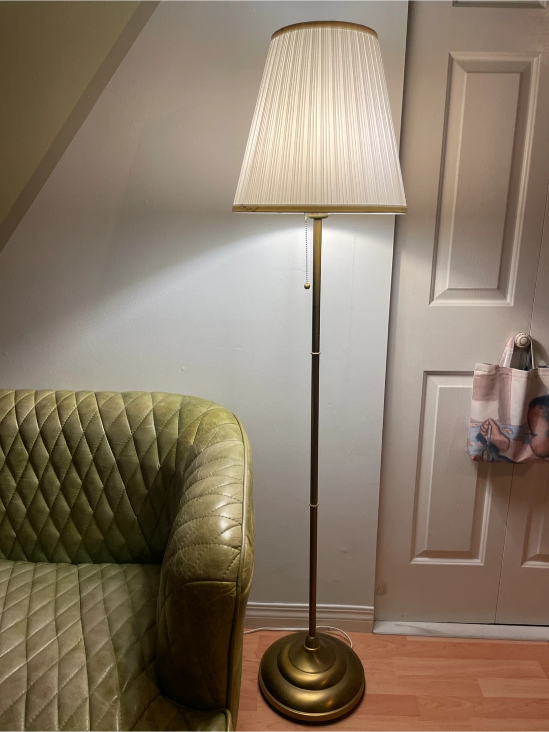 This IKEA ÅRSTID floor lamp has a classic design with a brass finish and a white pleated shade. It's perfect for adding ambient light to your living room or bedroom. The lamp features a convenient pull-chain switch and a sturdy base.