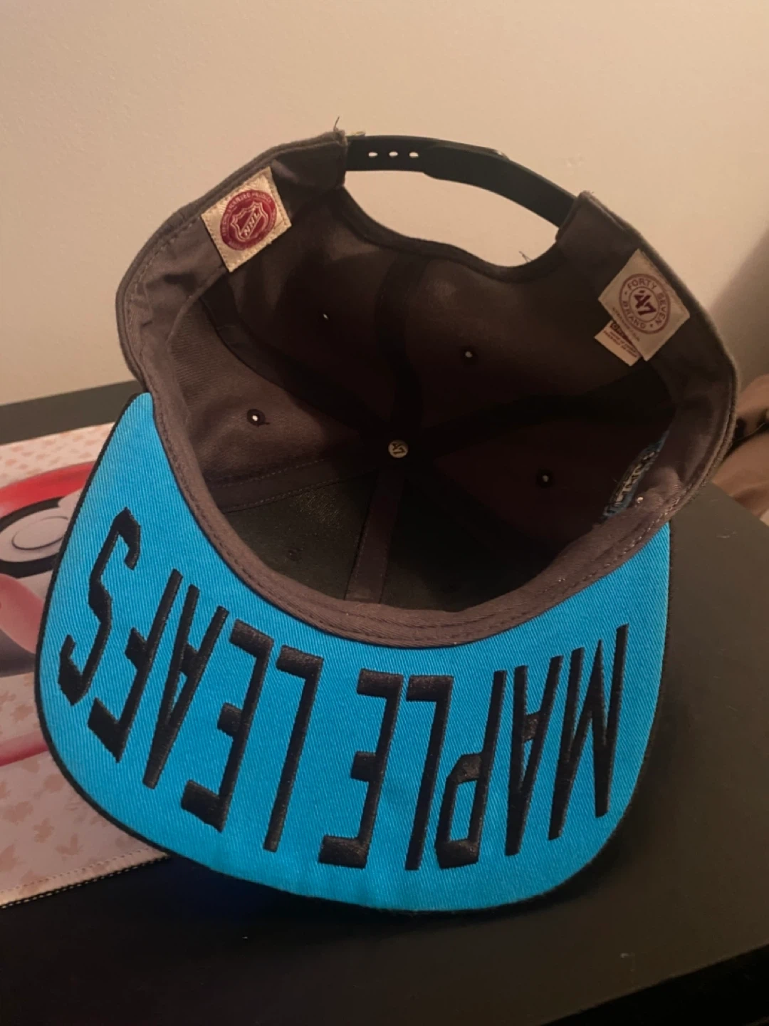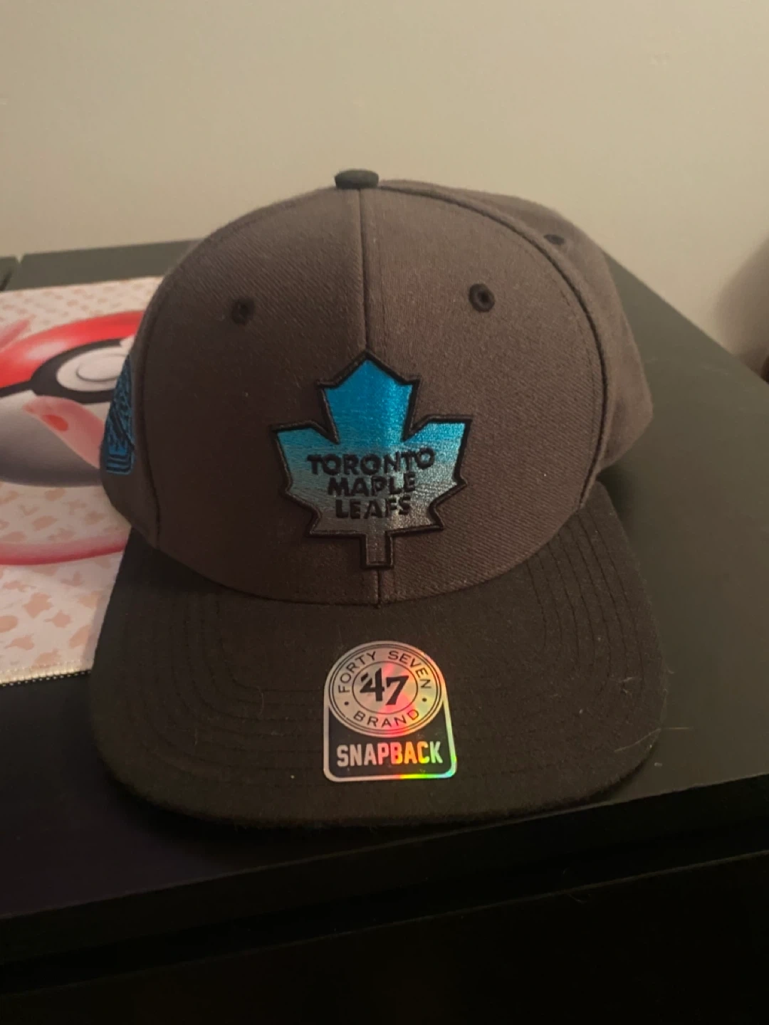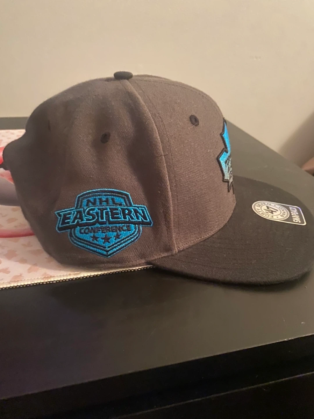 This is a Toronto Maple Leafs snapback hat from '47 Brand. It features the NHL Eastern Conference logo on the side and "Maple Leafs" embroidered on the underside of the brim. It's a snapback style, so it's adjustable.