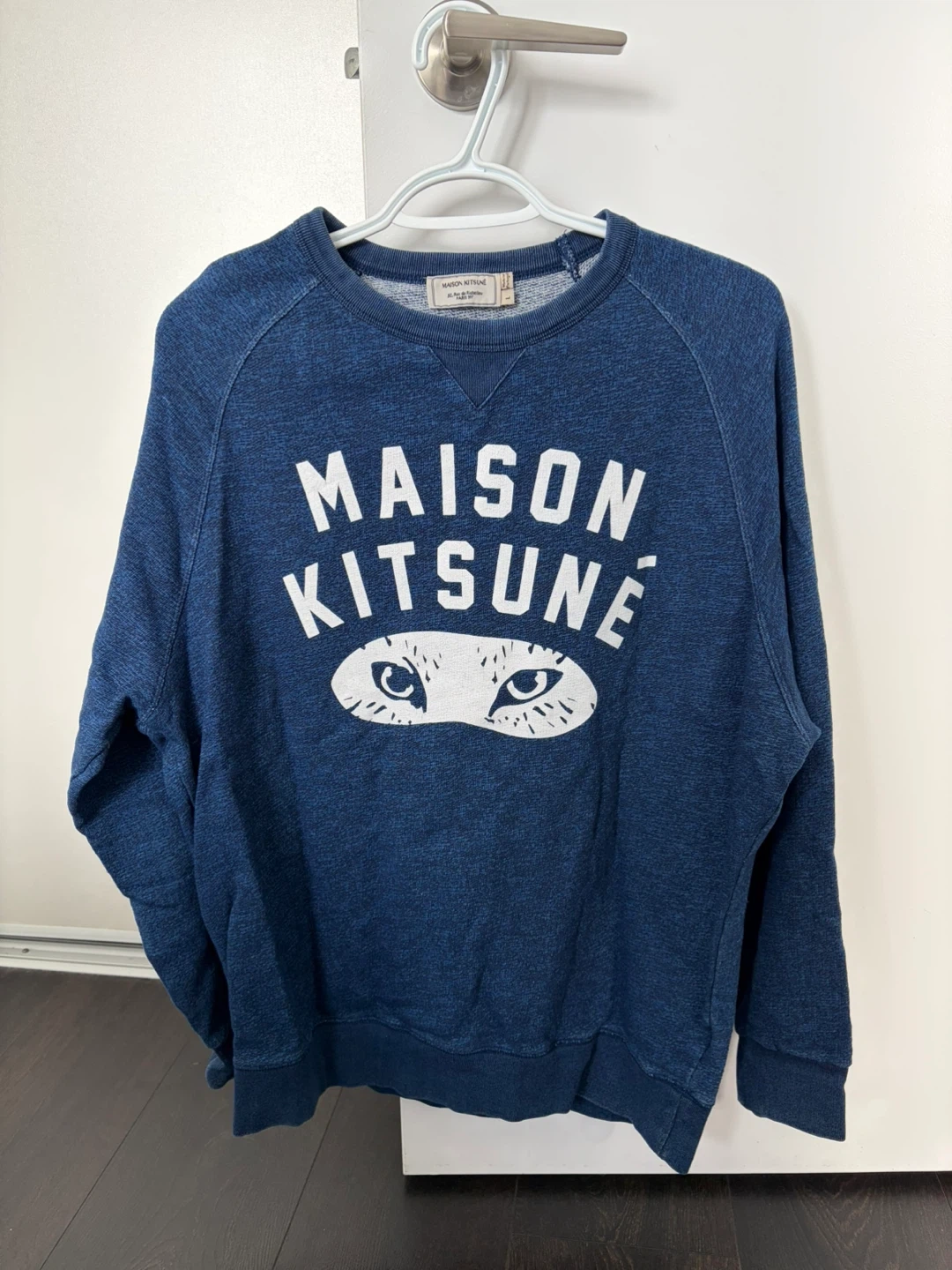 A classic Maison Kitsuné crewneck sweatshirt in a deep blue marled fabric. It features the iconic fox head logo graphic on the front. Size is large. Made in Portugal.