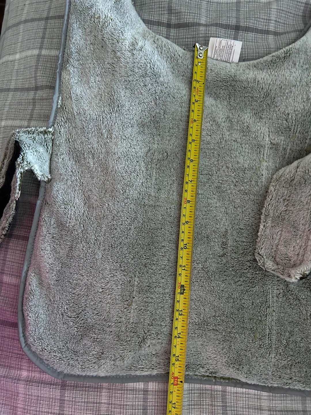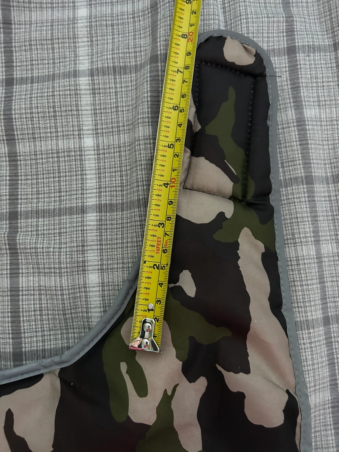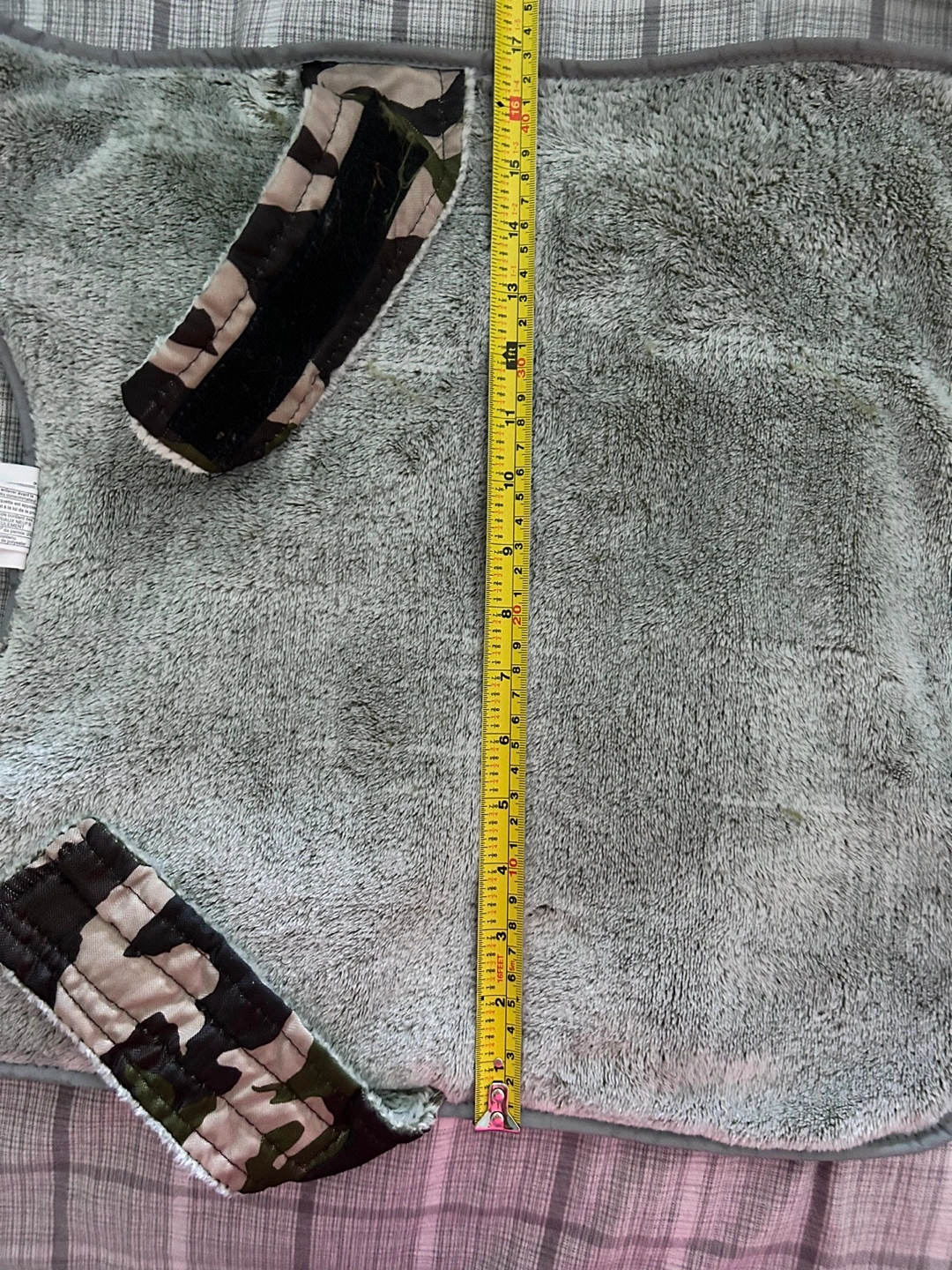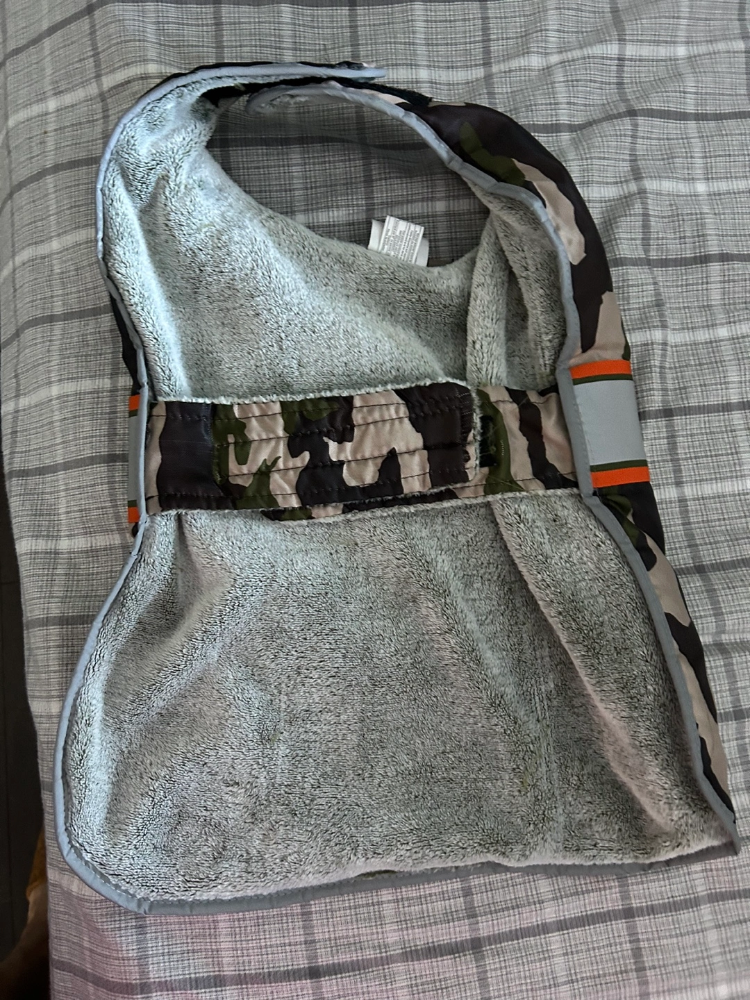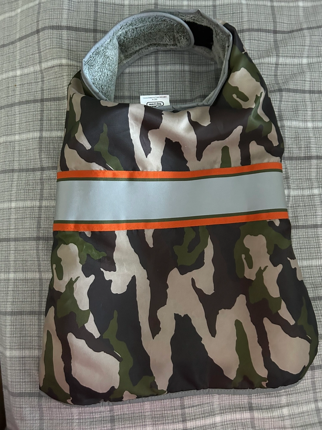 Top Paw dog coat. Features camo print, orange stripes, and grey fleece lining. Reflective strip for visibility.