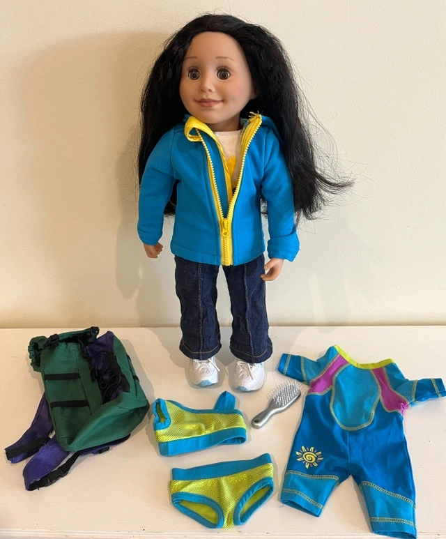 18" MaplLea Doll Alexi (Toronto) Includes original outfit + backpack, swim suite & wet suit. Story Journal included however used sections removed.