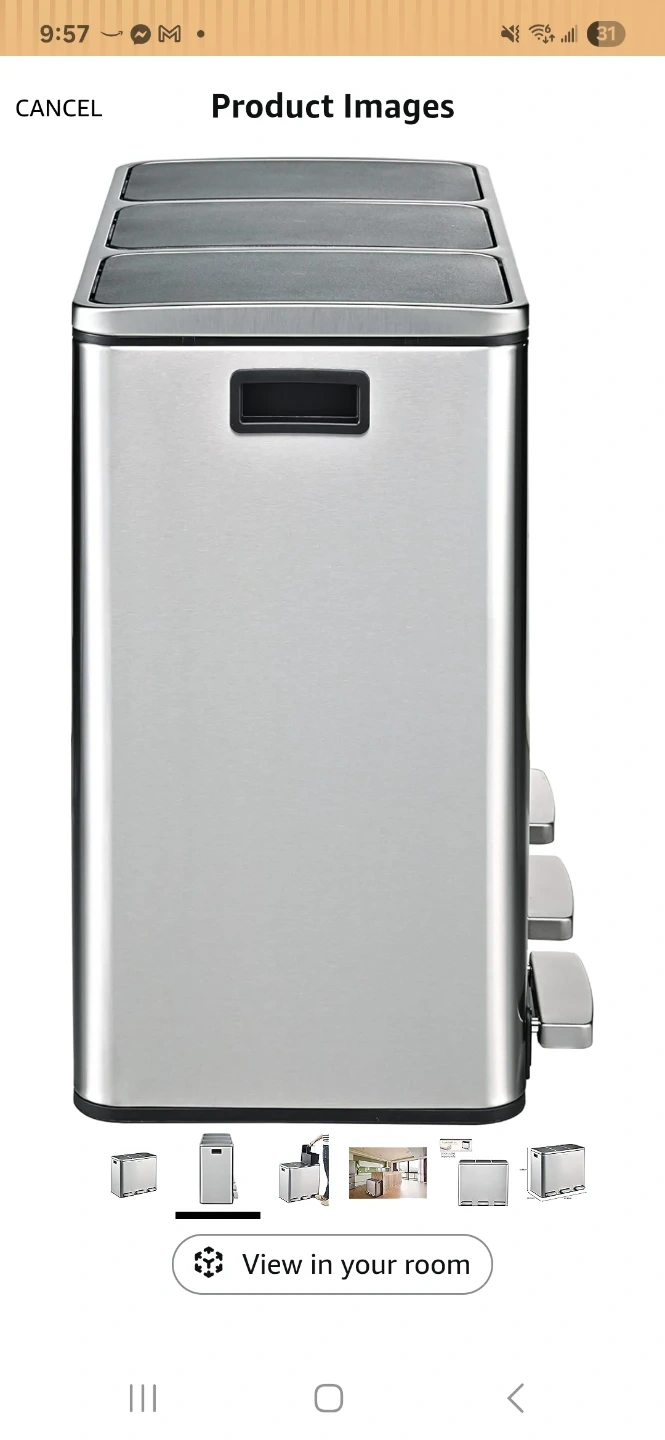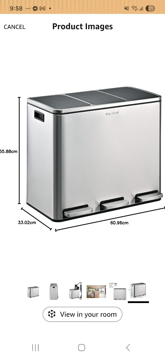 This Step N' Sort bin features three compartments, each holding 18L, for trash and recycling. It's made of stainless steel with slow-close lids and removable inner bins. The bin measures 60.96cm wide, 33.02cm deep, and 55.88cm tall.