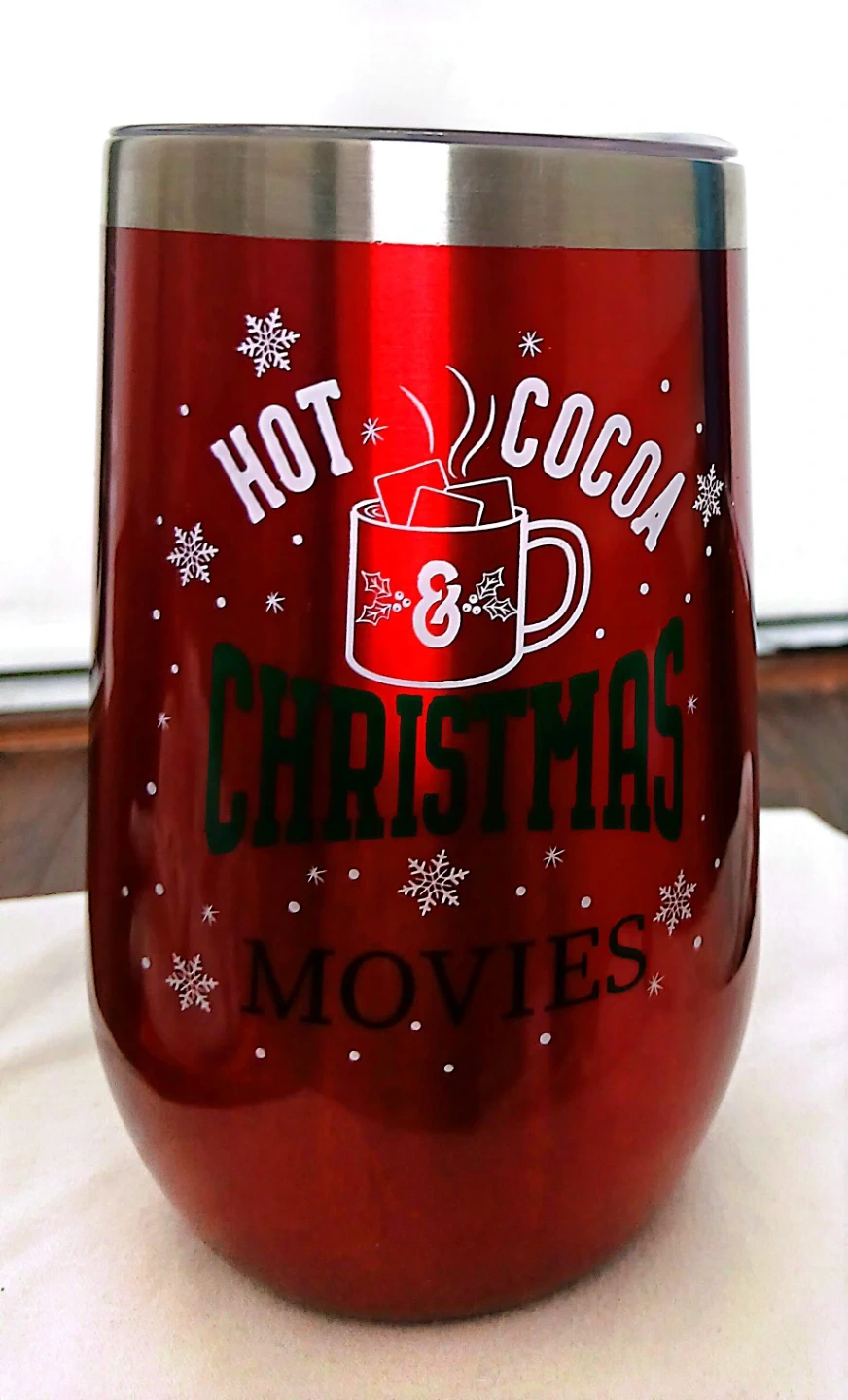 This festive red tumbler is perfect for enjoying hot cocoa while watching Christmas movies. It's made of durable material with a metallic finish. Great for holiday movie nights!