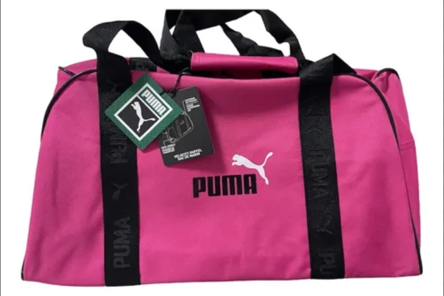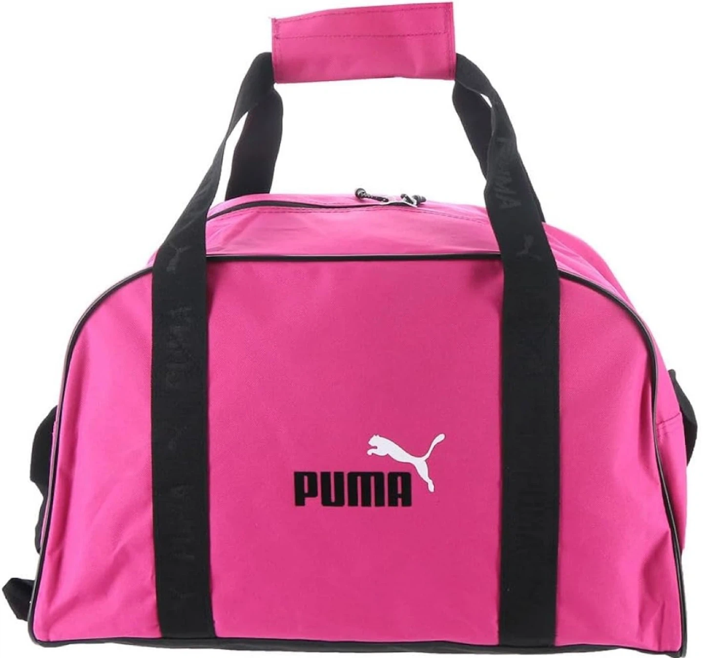 This is a bright pink duffel bag from Puma. It features dual top handles and a detachable shoulder strap for versatile carrying options. The bag has a zippered main compartment and an exterior zippered pocket for quick access to essentials. $20