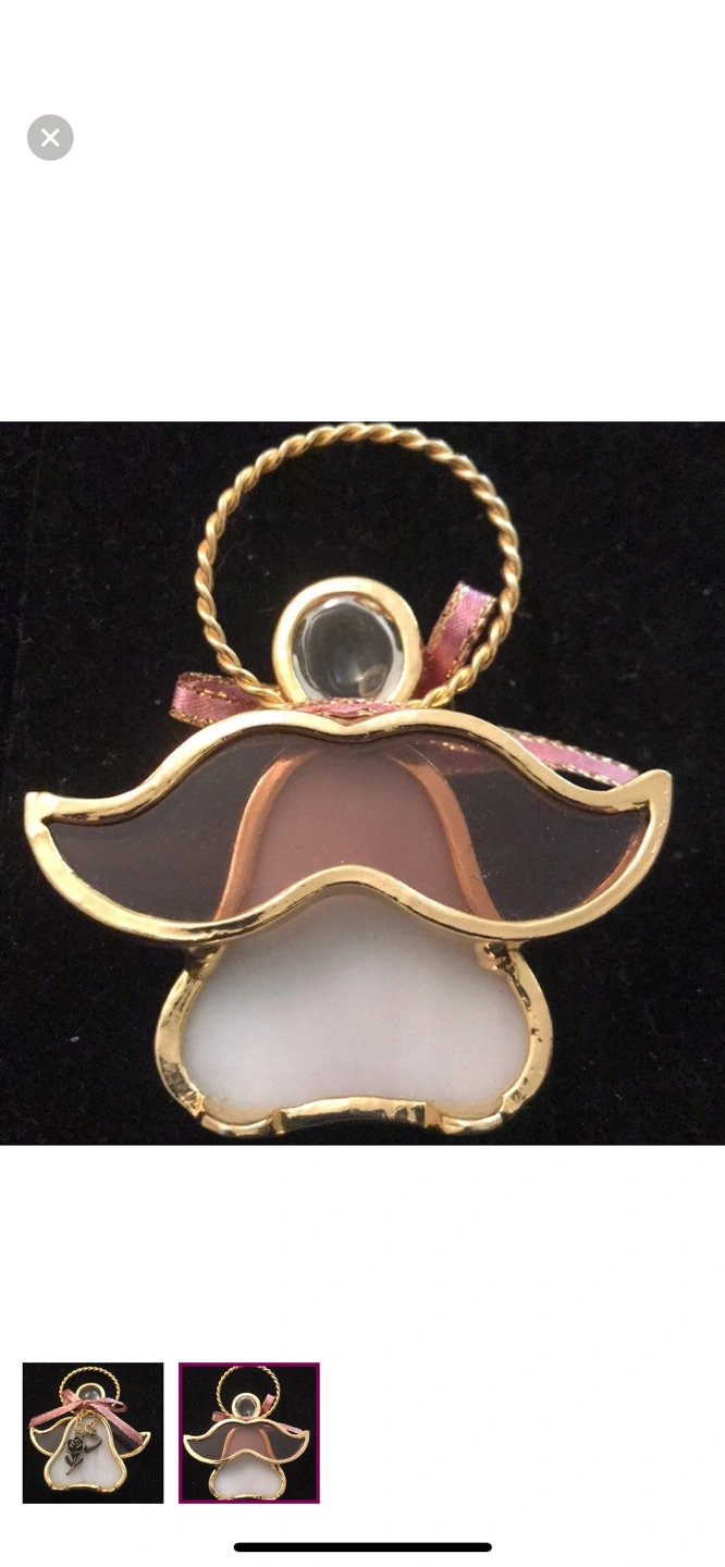 Lovely handmade stained glass angel pendant/charm. Features a gold frame, pink ribbon, and small charms. Perfect for Christmas or any occasion. Unique and delicate design.