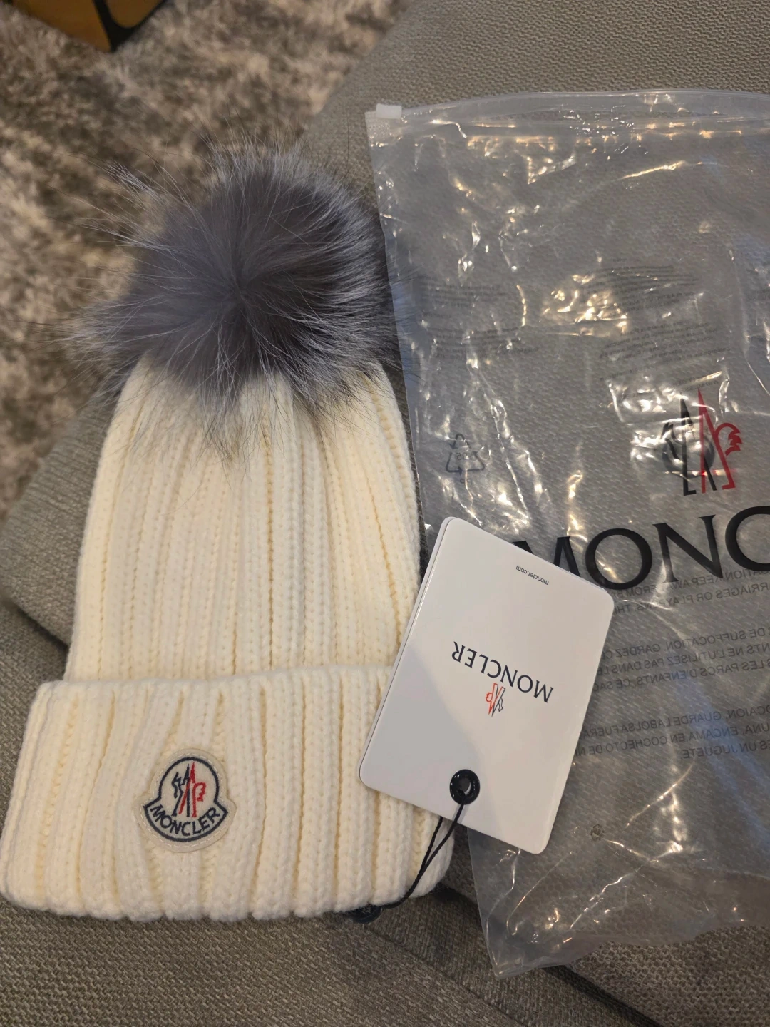 Creamy white ribbed knit beanie from Moncler. It features a classic design with a fluffy grey pom-pom on top. Includes original packaging and tag.It comes in different colors.