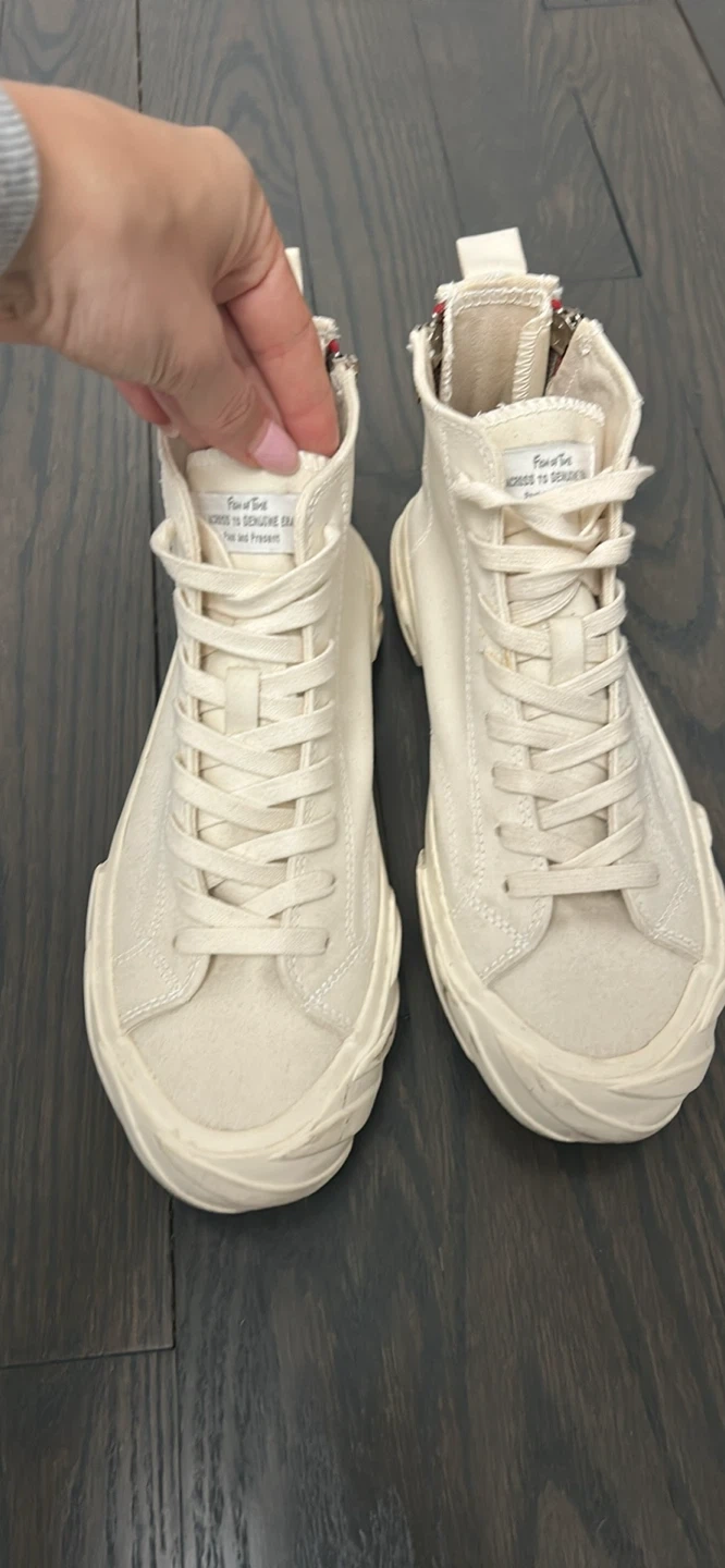 Cream canvas high-top sneakers with a side zipper and lace-up front. Size 6 UK / 40 EUR / US 7. 25.0 CM. Made in China.