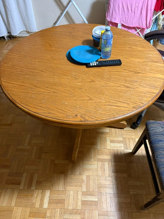 This is a round dining table perfect for a cozy dining space, accompanied by 2 matching chair. It is in good condition, showing signs of wear that add character to its solid construction. Perfect for intimate meals or as a charming accent piece in your home. It brings a touch of warmth to any room. If the ad is up, the table is available!