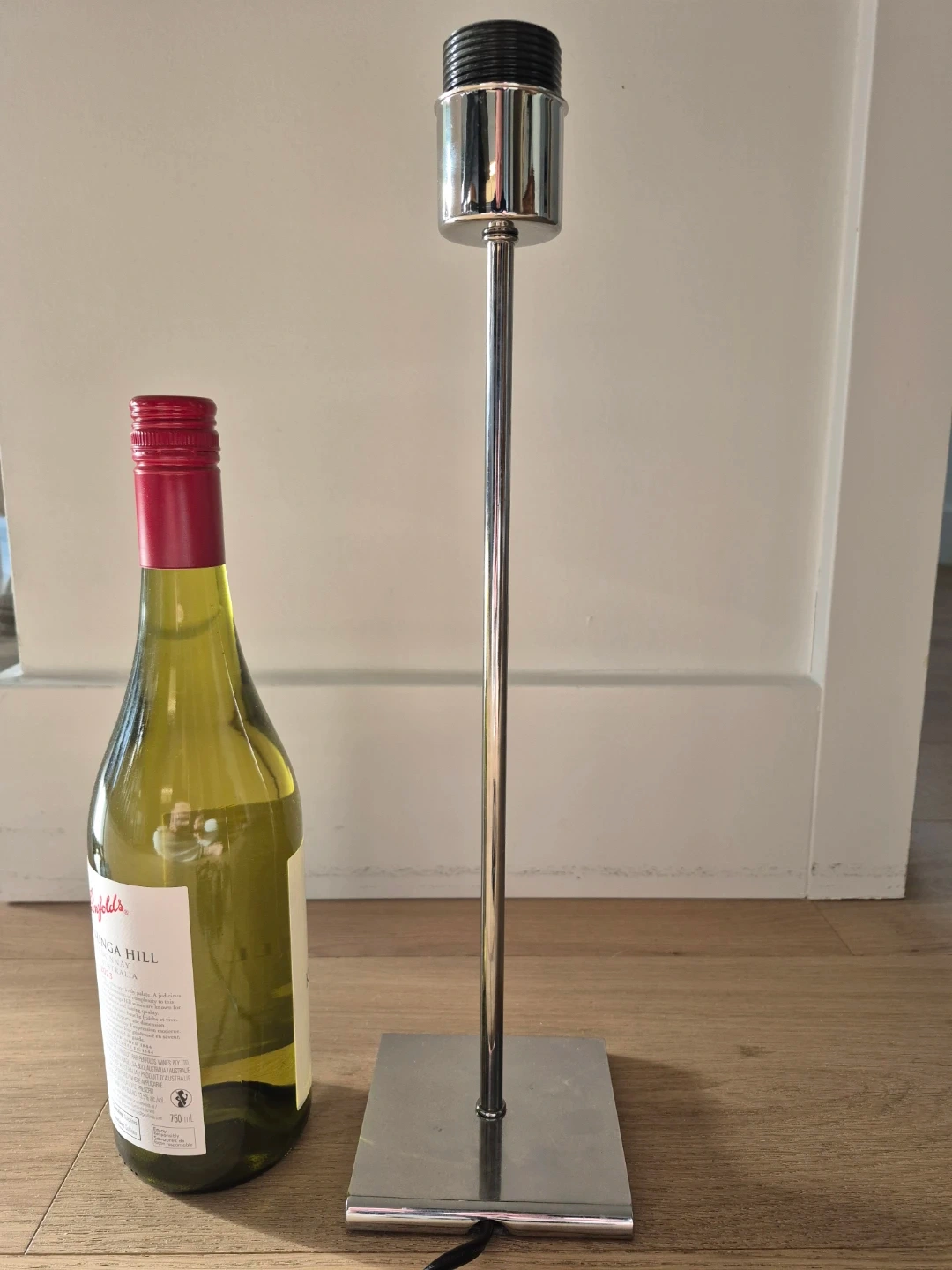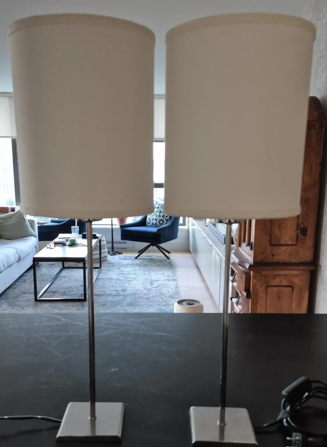 Each lamp features a sleek chrome stand and a simple cream cylindrical lampshade.