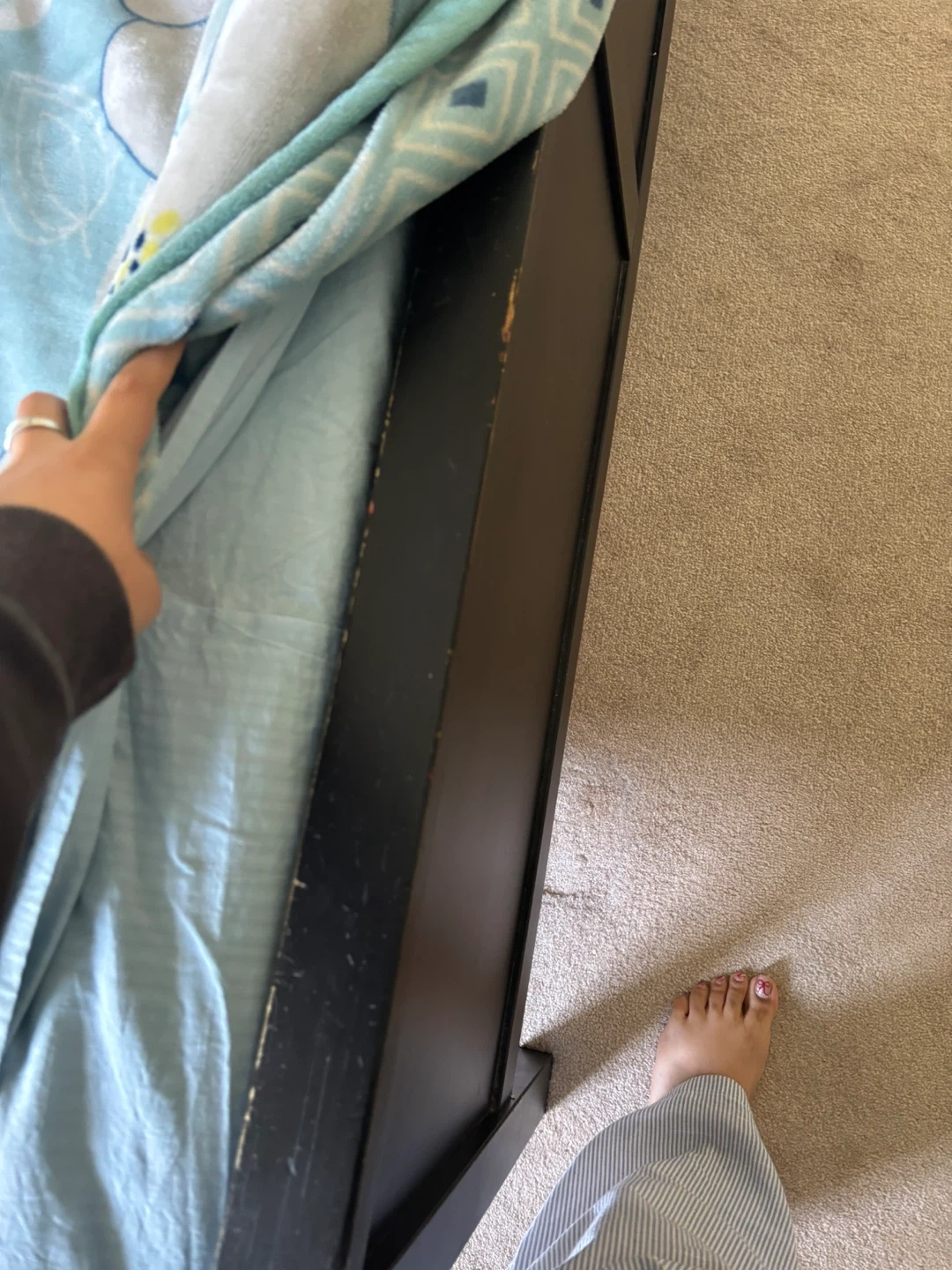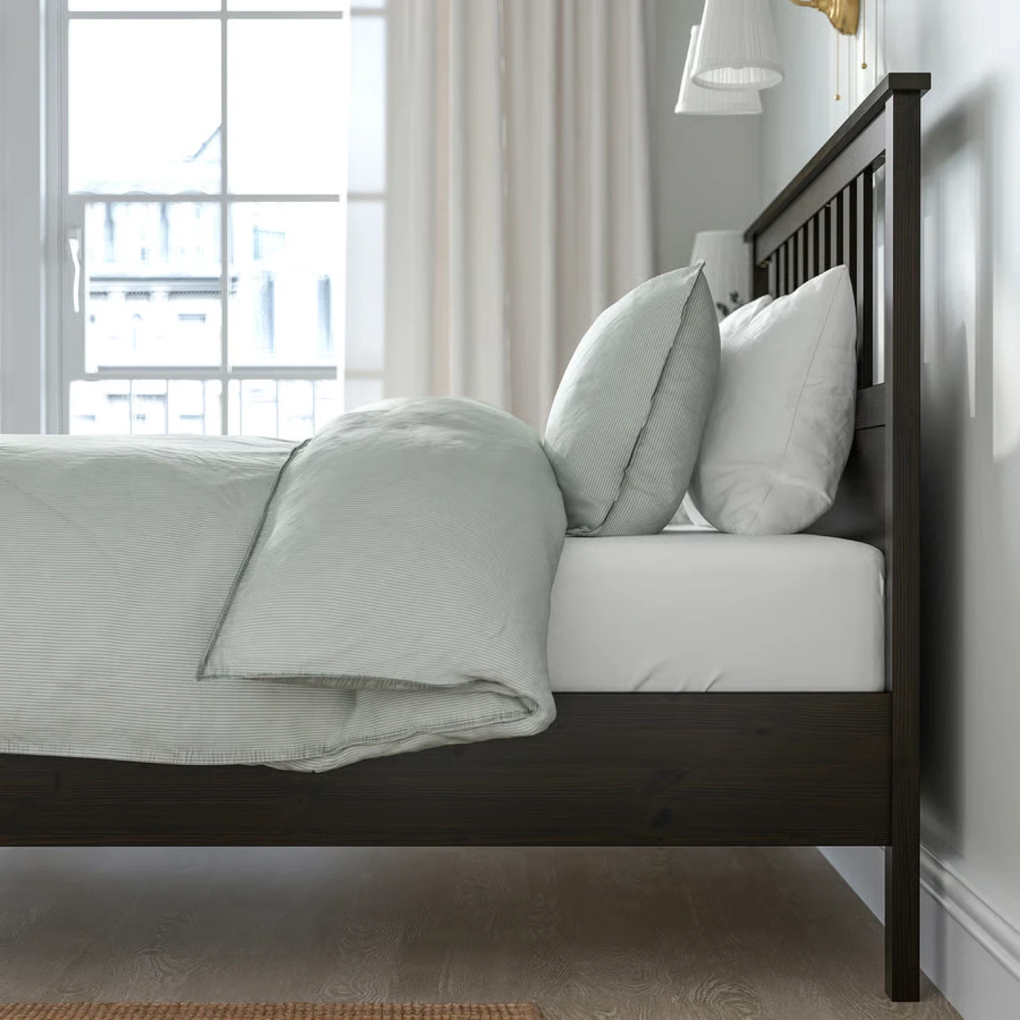 A classic dark wood bed frame with a slatted headboard. It has a sturdy construction and a timeless design. This bed frame provides a solid foundation for your mattress. The frame does have some minor scuffs but they’re easily covered by the sheets.