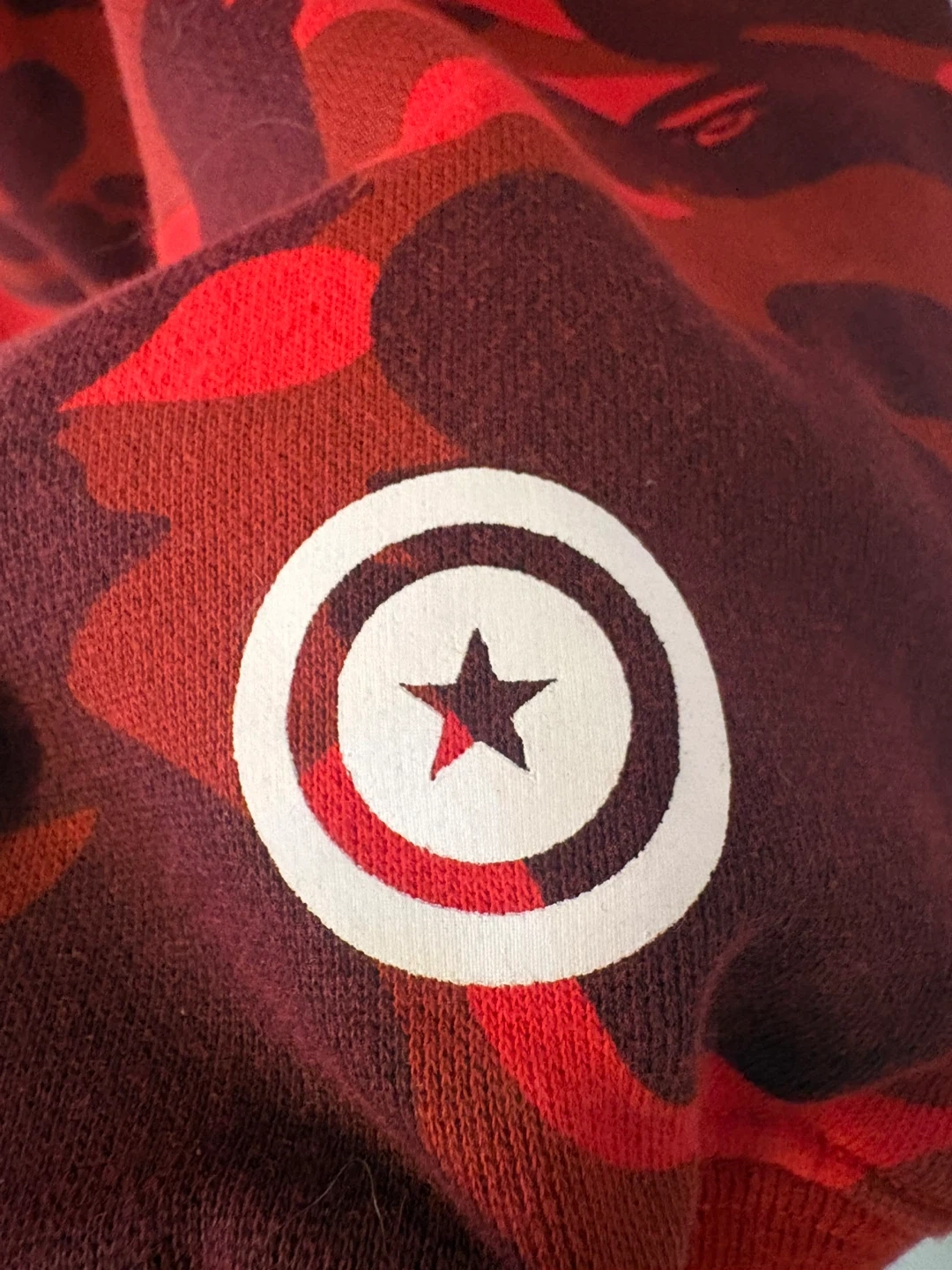 This BAPE hoodie features the iconic red camouflage pattern. It's a full-zip style with embroidered lettering on the front. This piece is great for adding a streetwear vibe to your look.