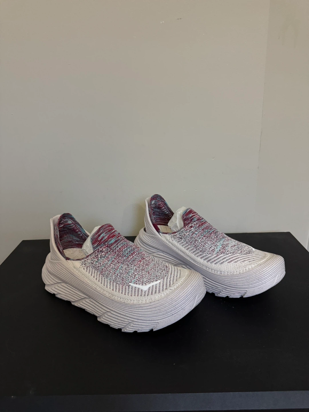 These Hoka One One slip-on sneakers are designed for comfort and ease of wear. They feature a knit upper with a colourful marled pattern and a durable sole. Brand new in box