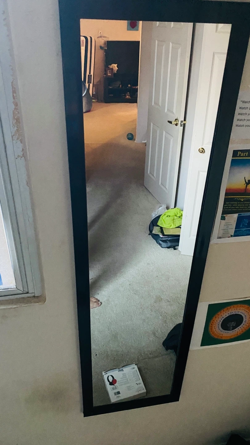 A full length mirror with a black frame, and there is another same size with white frame. It's great for checking outfits before heading out the door. The mirror has a simple, modern design that fits into most rooms. It's perfect for bedrooms or hallways!