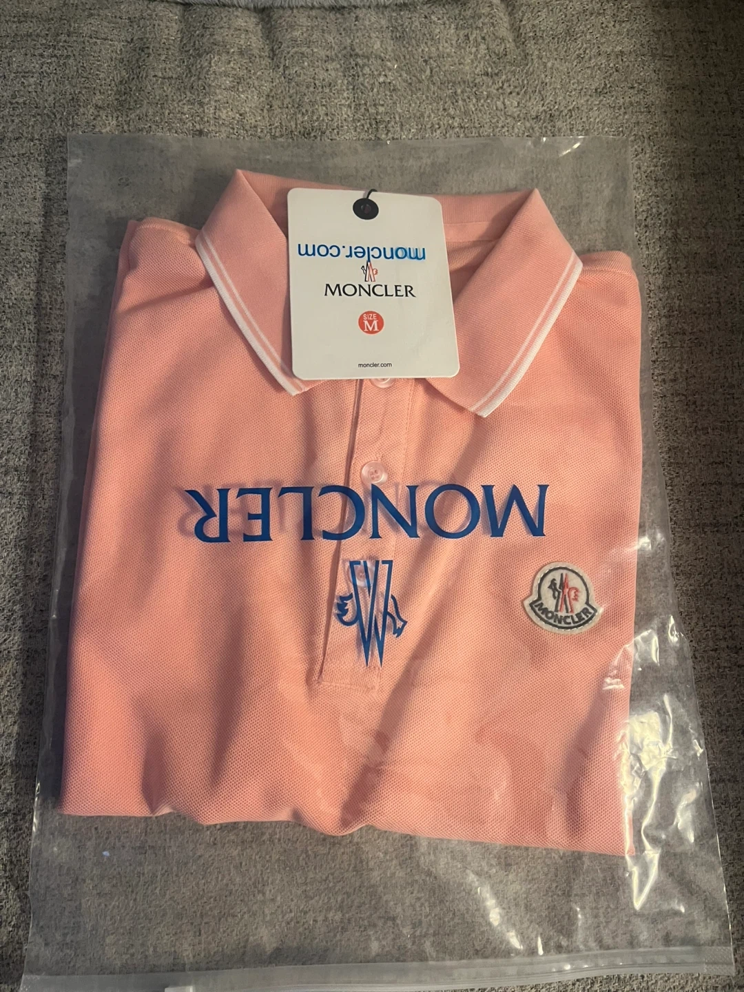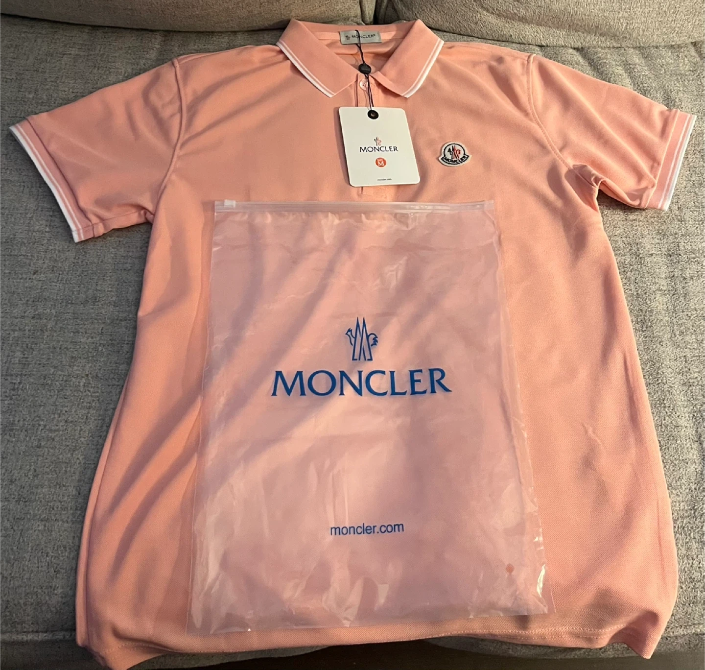 Brand new Moncler polo shirts, available in pink and black. Comes with original packaging. Size medium. These shirts feature a classic polo collar with striped trim and embroidered Moncler logos.