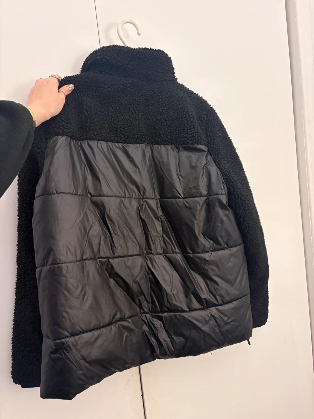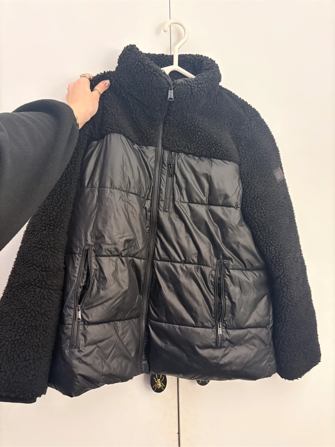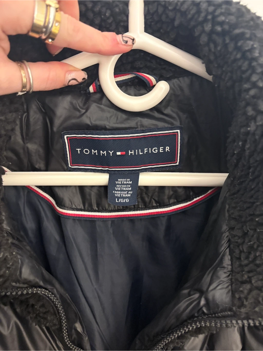 Tommy Hilfiger black puffer jacket with sherpa detailing. It features a full zip closure and zippered pockets. Size large which is good to fit sweaters underneath. I wore it as a winter jacket and loved it just not my style anymore!