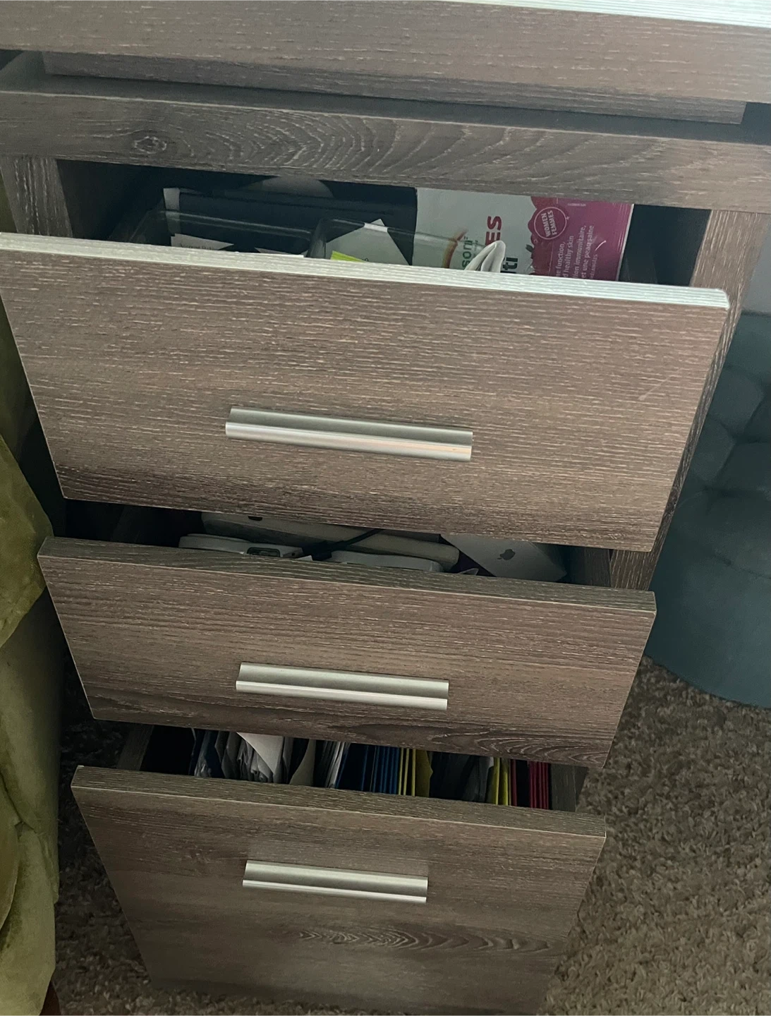 Looking to sell this L-shaped computer desk! It features a three-drawer cabinet and open shelves for storage. The desk is a nice neutral colour that would fit in with most decor.