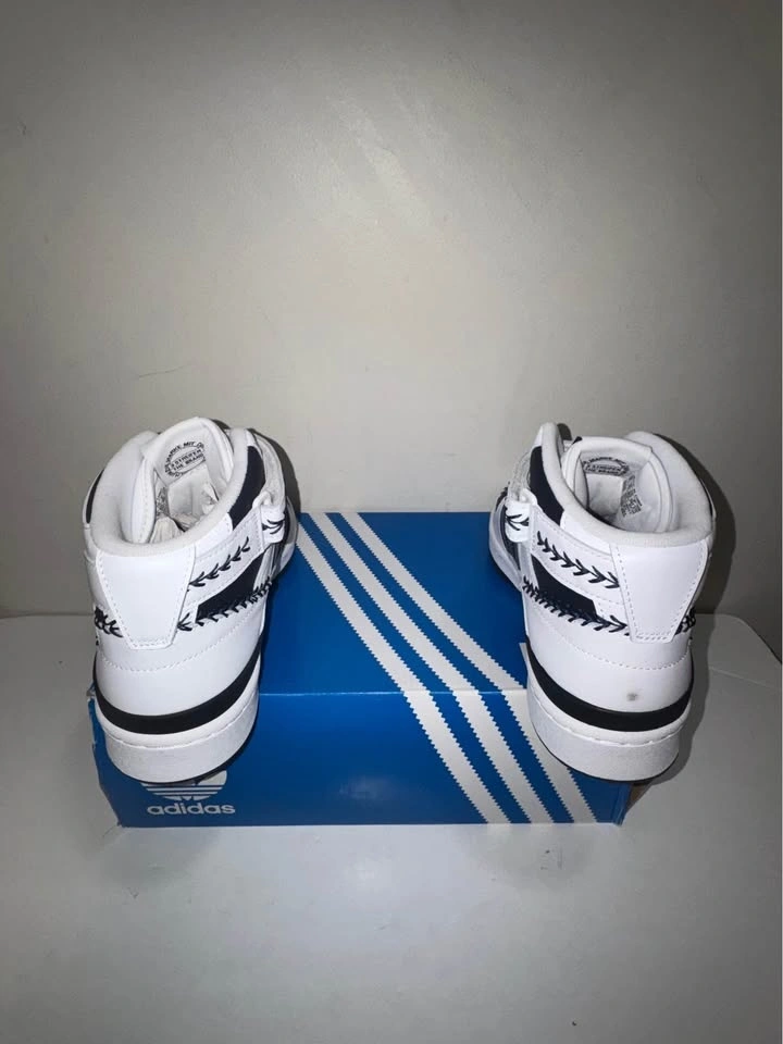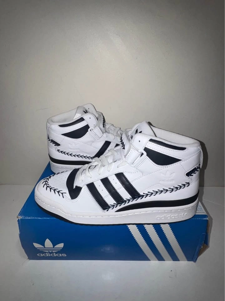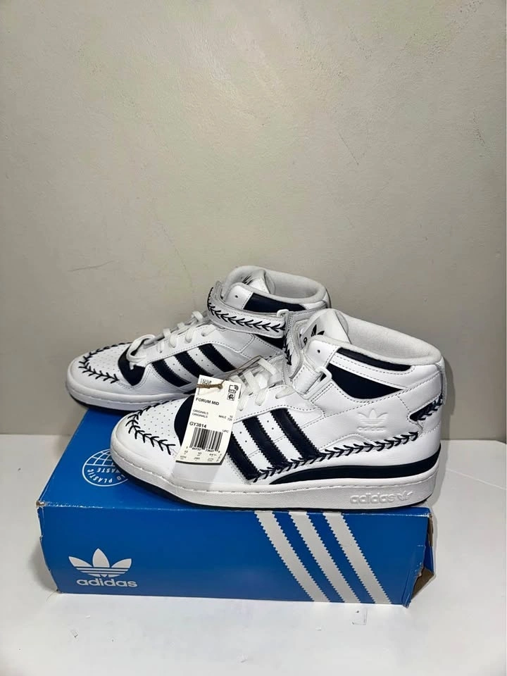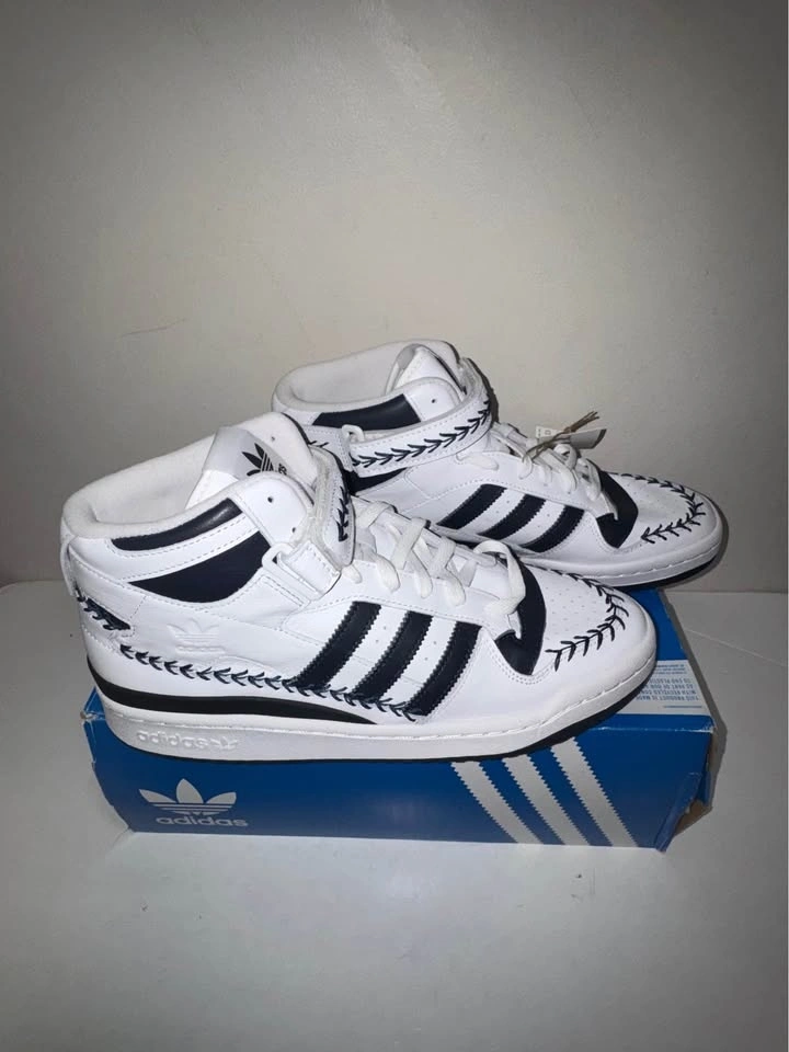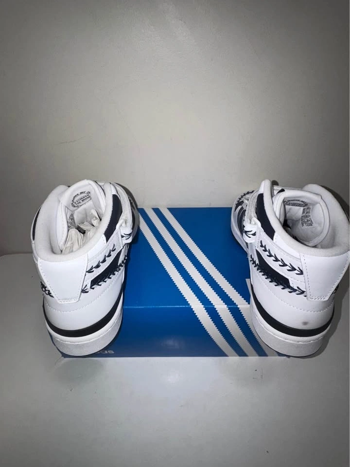 Crisp authentic Adidas Forum Mid sneakers in white with black stripes and decorative stitching. High-top style. Men's size 10.5 US. Still has tags on and comes with original box. New in box. Pick up only. Cash only. Located near Brampton Gateway Terminal and Shopper World Mall Brampton. Address will be provided when pickup time is scheduled.