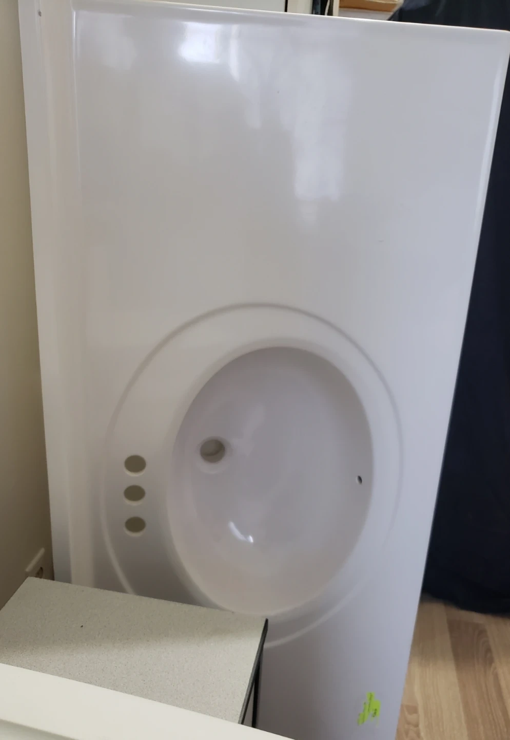 This is a white bathroom countertop. It's made of a durable material and has three pre-drilled holes for faucet installation. The basin features a central drain opening. Drain assembly not included