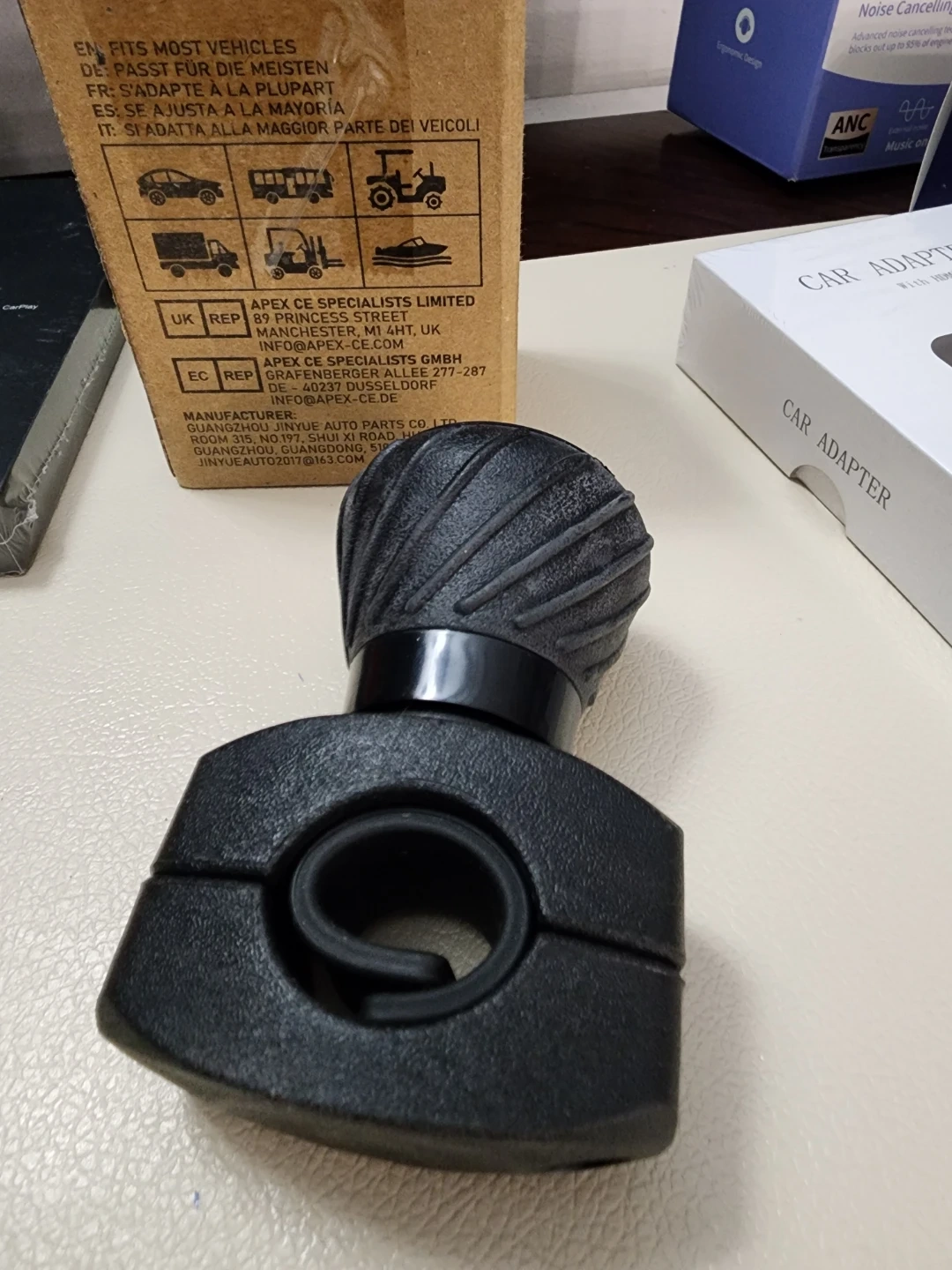 This steering wheel spinner knob fits most vehicles. It's made of black plastic with a textured grip. Includes original box.