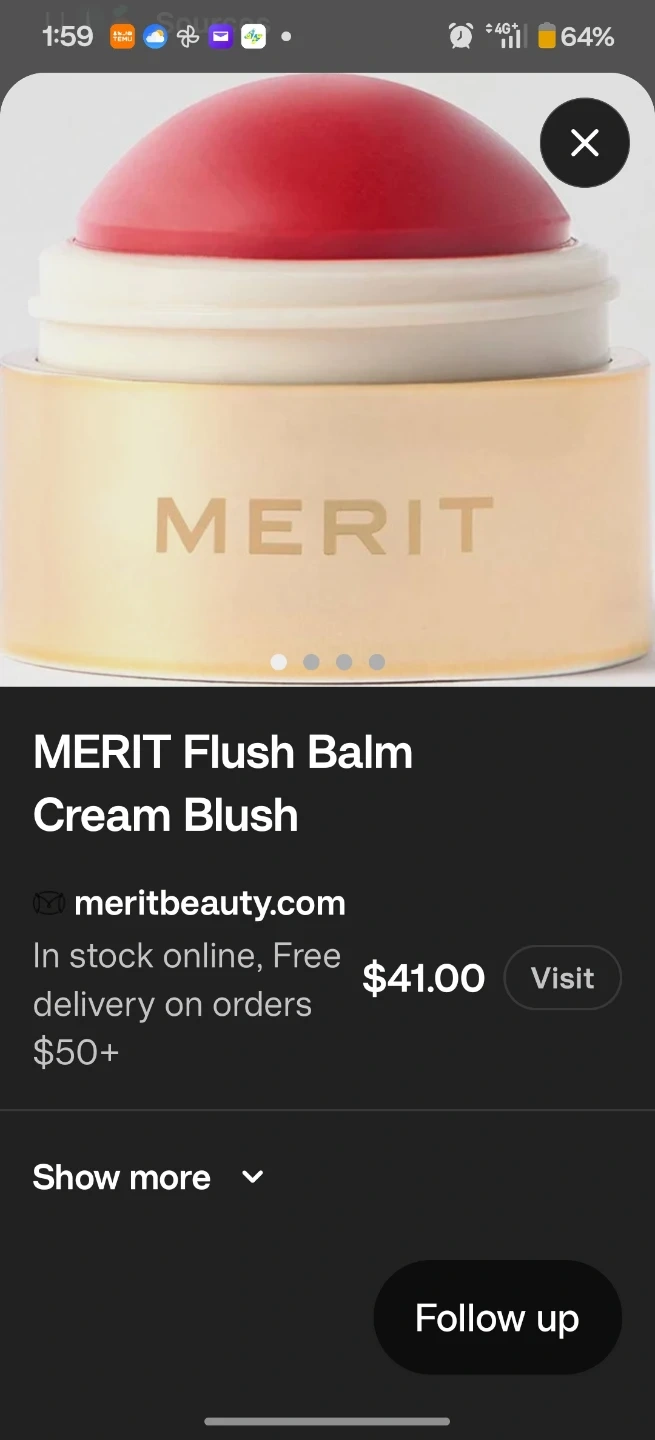 MERIT Flush Balm Cream Blush in shade Rouge. This is a cream blush for your cheeks. It's easy to apply for a natural flush of colour. Net weight 0.31 oz (9g).