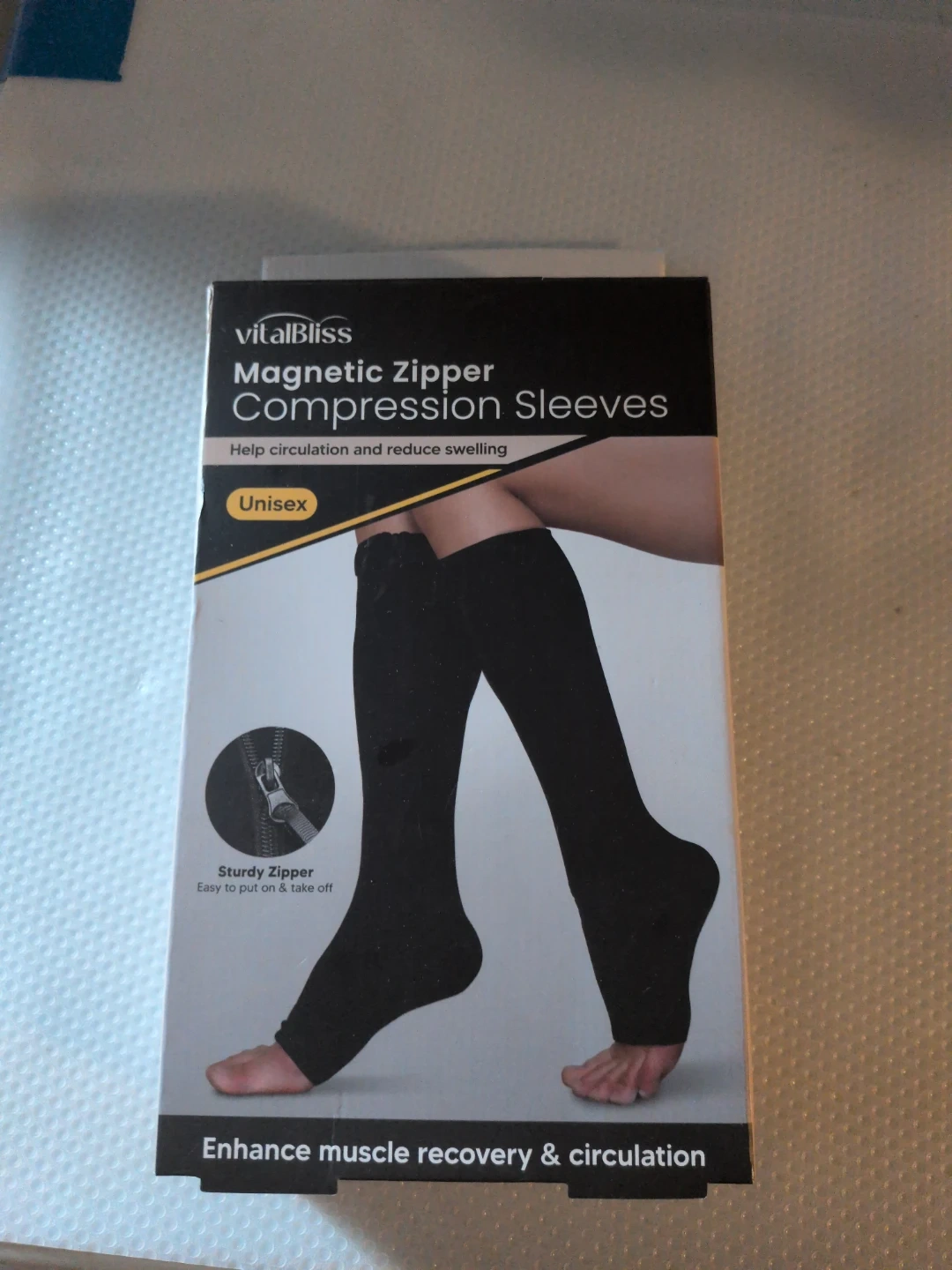 Never used.. wouldn't fit, didn't realize untill return date passed. These VitalBliss compression sleeves help circulation and reduce swelling. They're unisex and feature a sturdy zipper for easy on and off. These sleeves enhance muscle recovery and circulation.