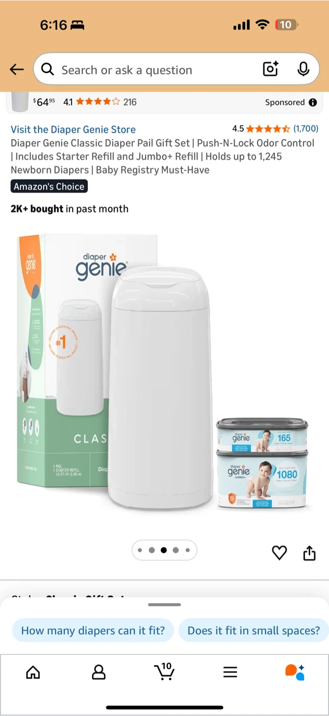 This set includes the Diaper Genie Classic Diaper Pail with Push-N-Lock Odor Control. It comes with a starter refill and a jumbo+ refill. The pail holds up to 1,245 newborn diapers. It's a baby registry must-have!