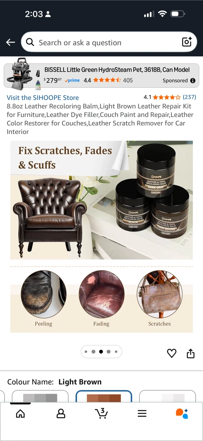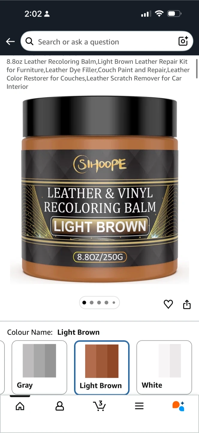 SIHOOPE Leather & Vinyl Recoloring Balm in Light Brown. This 8.8oz container helps fix scratches, fades, and scuffs on leather and vinyl. It's great for refreshing furniture, couches, and car interiors.
