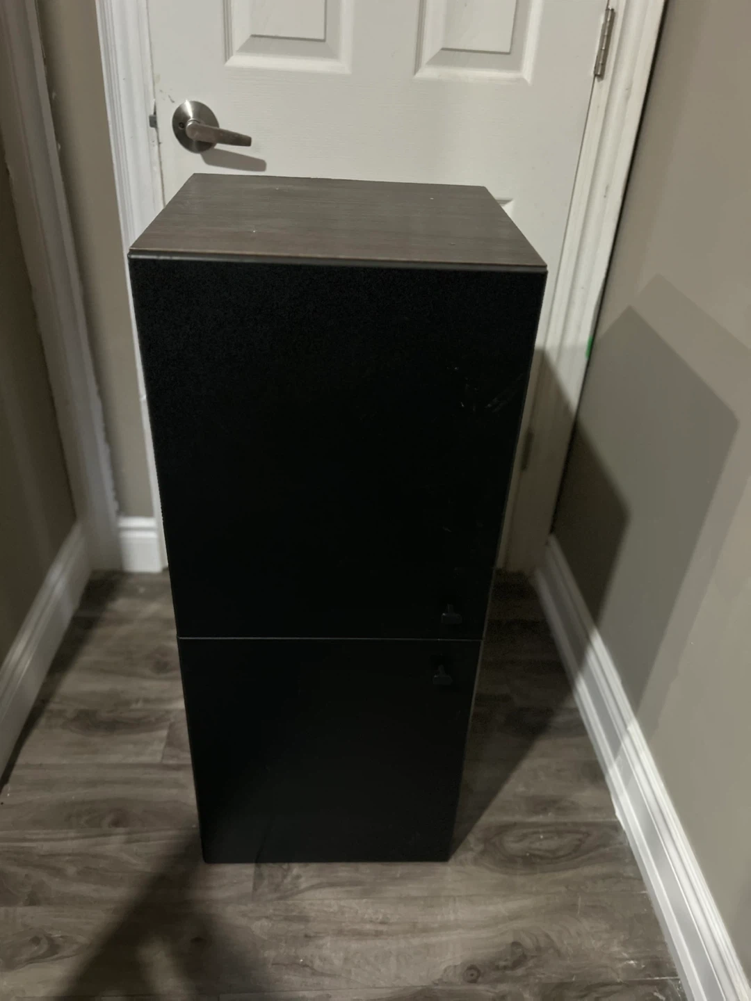 Selling a black wood storage cabinet. It's in great shape and perfect for adding some extra storage space to any room in your home!