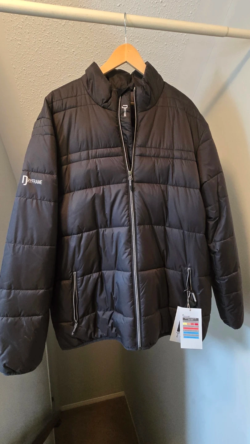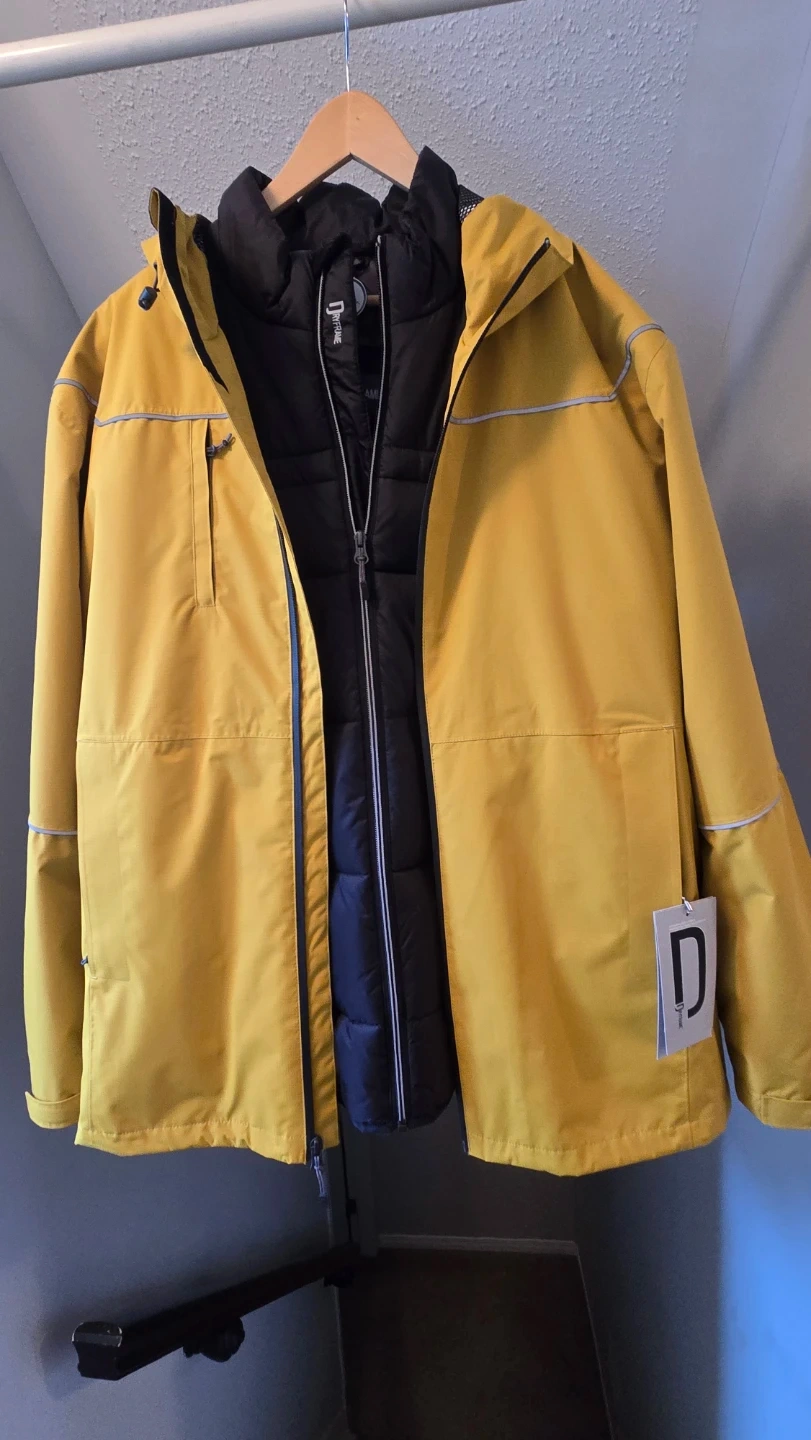 Yellow hooded waterproof shell with reflective detailing and a black puffer jacket worn as a liner for cold weather comfort. Both are great for layering in unpredictable weather. Zipped front closures on both.