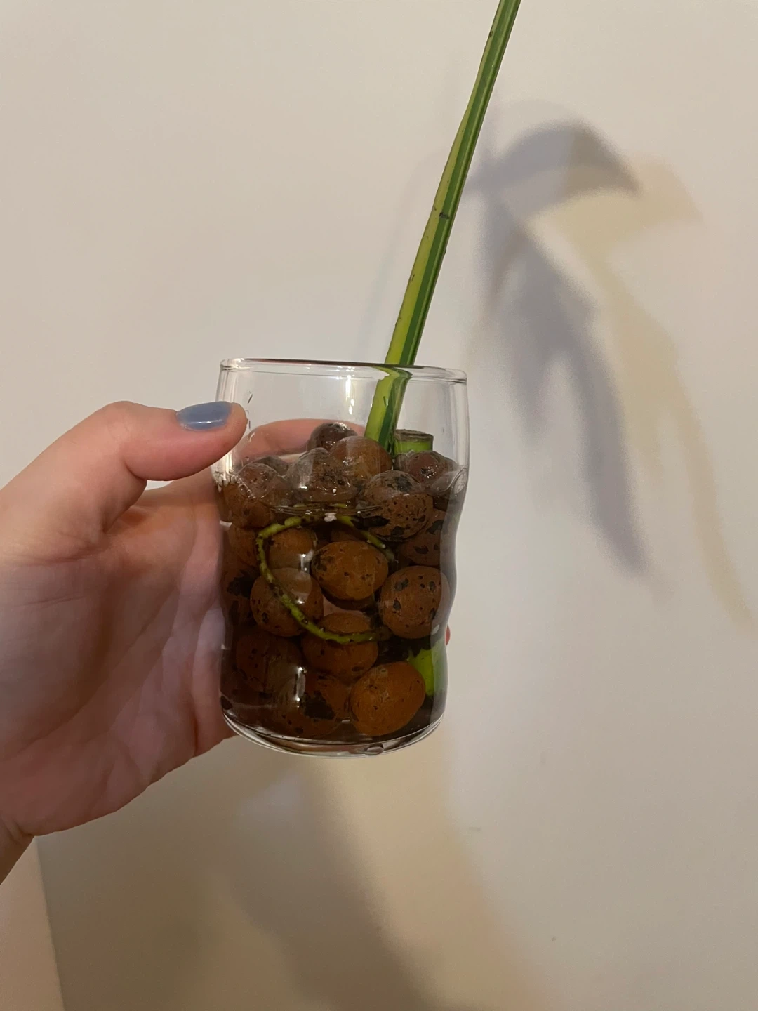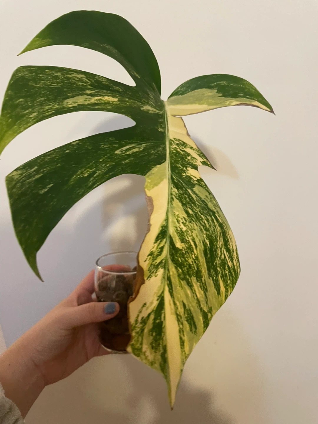 Beautiful Monstera Aurea cutting rooted in water and leca. Features striking variegation with green and cream colours. This plant's stem is partially submerged in water inside a clear glass. It's a great starter piece for any plant enthusiast!