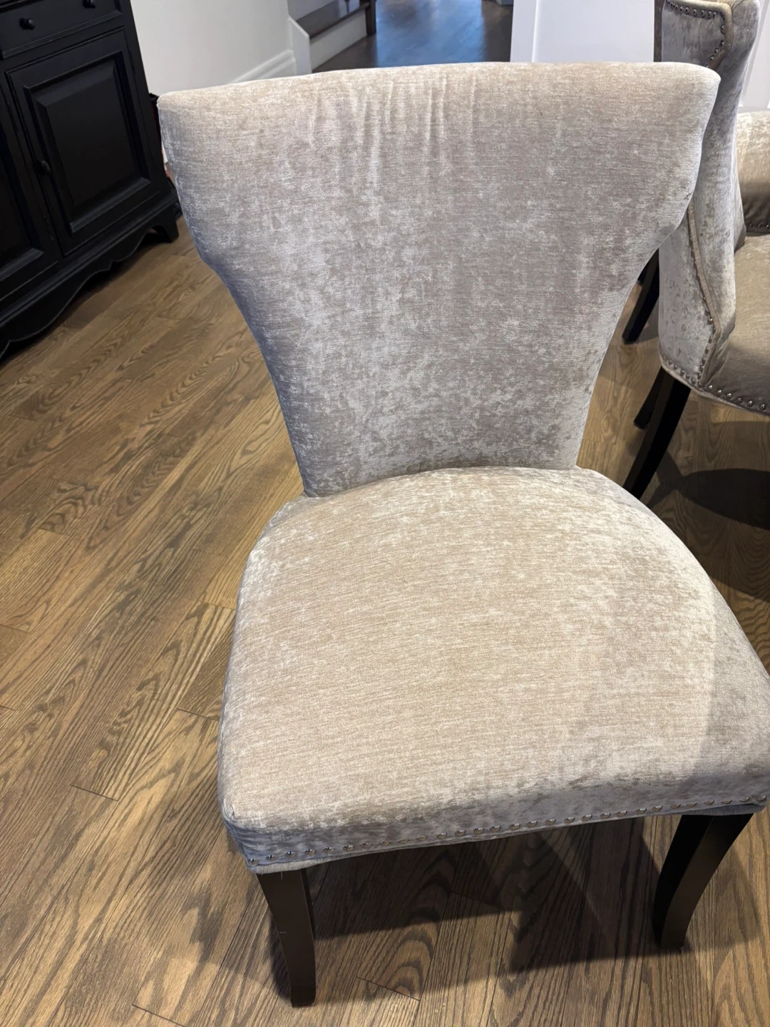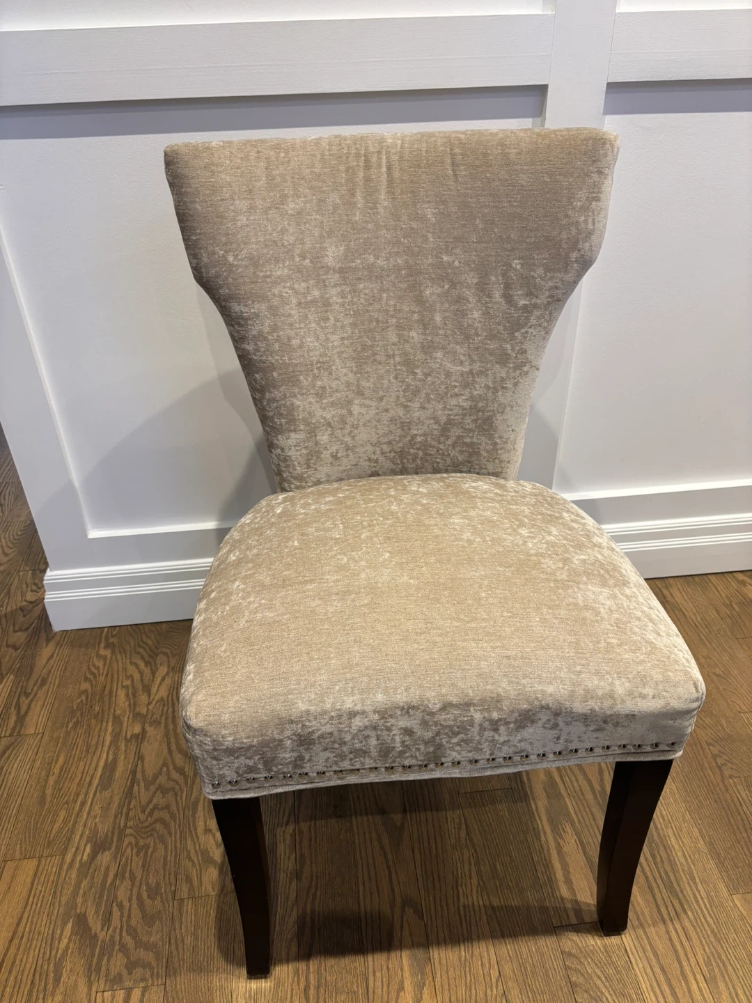 Beautiful set of six beige velvet dining chairs. They feature a sophisticated wingback design with elegant nailhead trim. The upholstery is a soft, plush velvet material. These chairs are sure to add a touch of class to any dining room!